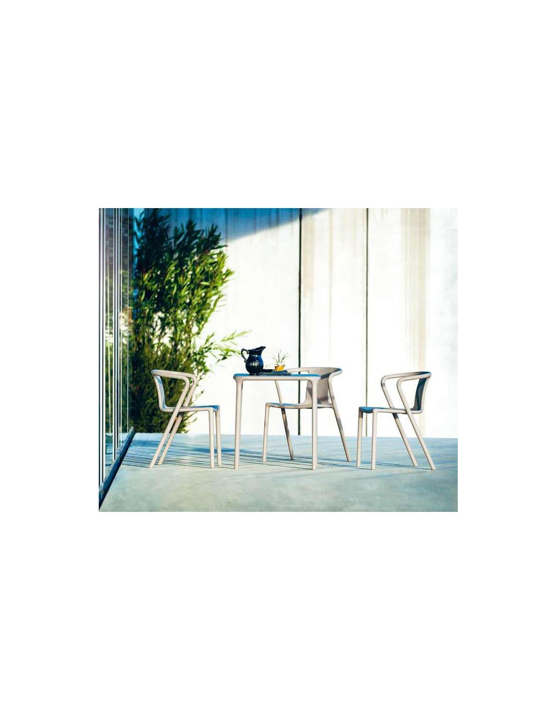 Fauteuil empilable en polypropyléne recyclable. solide et stable. Convient pour une utilisation contractuelle en extérieur.