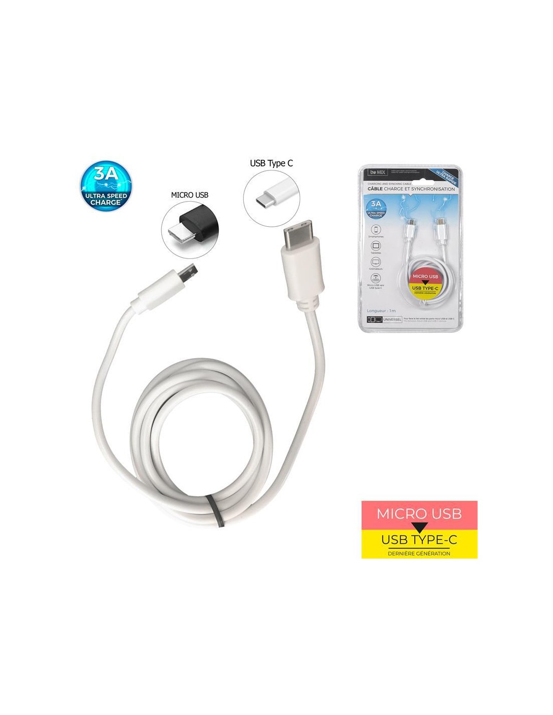 cable ultra rapide 3a syn port usb-c micro usb m12