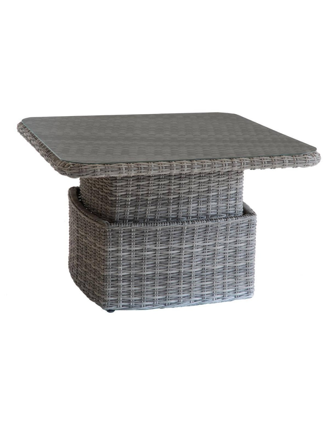 Aluminium traité époxy, Résine tressée, Verre TrempéL. 110 x P. 110 x H. 45/69 cmHauteur table max : 69 cmHauteur table min : 45 cmAluminium traité époxy, Résine tressée, Verre TrempéL. 110 x P. 110 x H. 45/69 cmHauteur table max : 69 cmHauteur table min : 45 cm