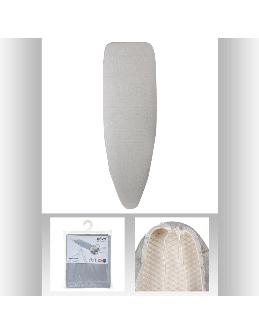 Planche é repasser avec hauteur ajustable jusqu'é 92cm. Repose fer (5kg max) Dimensions du plateau: 110x40cm - compatible avec les housses 5Five en taille S/T1. Housse 100% coton (137g/mé) et mousse de 1mm d'épaisseur 100% polyester.