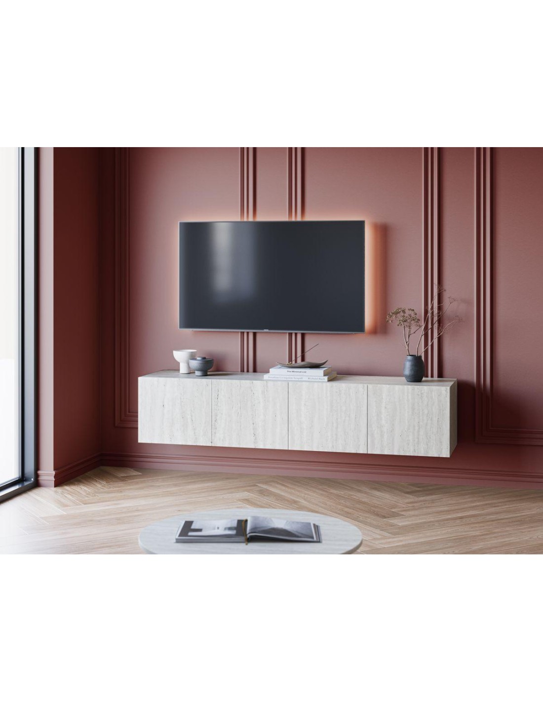 Meuble TV suspendu :4 portes 180 cm LECCE effet travertinLes + produits :-Finition effet travertin 100% tendance.-Meuble TV suspendu afin de garder un intérieur épuré.-Dimensions idéales pour les grands espaces.Dimensions du meuble 4 portes :Longueur : 180 cm Largeur : 35 cm Hauteur : 38,5 cmDimension du meuble 3 portes :Longueur : 140 cm Largeur : 35 cm Hauteur : 38,5 cmMatiére : Panneaux de particulesFinition : Effet travertinNombre de portes :4 ou 3Passe cable : OuiStyle : ModerneFabrication : EuropeA monter soi-méme: Oui (Kit)Systéme d'ouverture Push : NonType de meuble TV :SuspenduCharge maximum plateau supérieur 30kgMeuble TV suspendu :4 portes 180 cm LECCE effet travertinLes + produits :-Finition effet travertin 100% tendance.-Meuble TV suspendu afin de garder un intérieur épuré.-Dimensions idéales pour les grands espaces.Dimensions du meuble 4 portes :Longueur : 180 cm Largeur : 35 cm Hauteur : 38,5 cmDimension du meuble 3 portes :Longueur : 140 cm Largeur : 35 cm Hauteur : 38,5 cmMatiére : Panneaux de particulesFinition : Effet travertinNombre de portes :4 ou 3Passe cable : OuiStyle : ModerneFabrication : EuropeA monter soi-méme: Oui (Kit)Systéme d'ouverture Push : NonType de meuble TV :SuspenduCharge maximum plateau supérieur 30kg