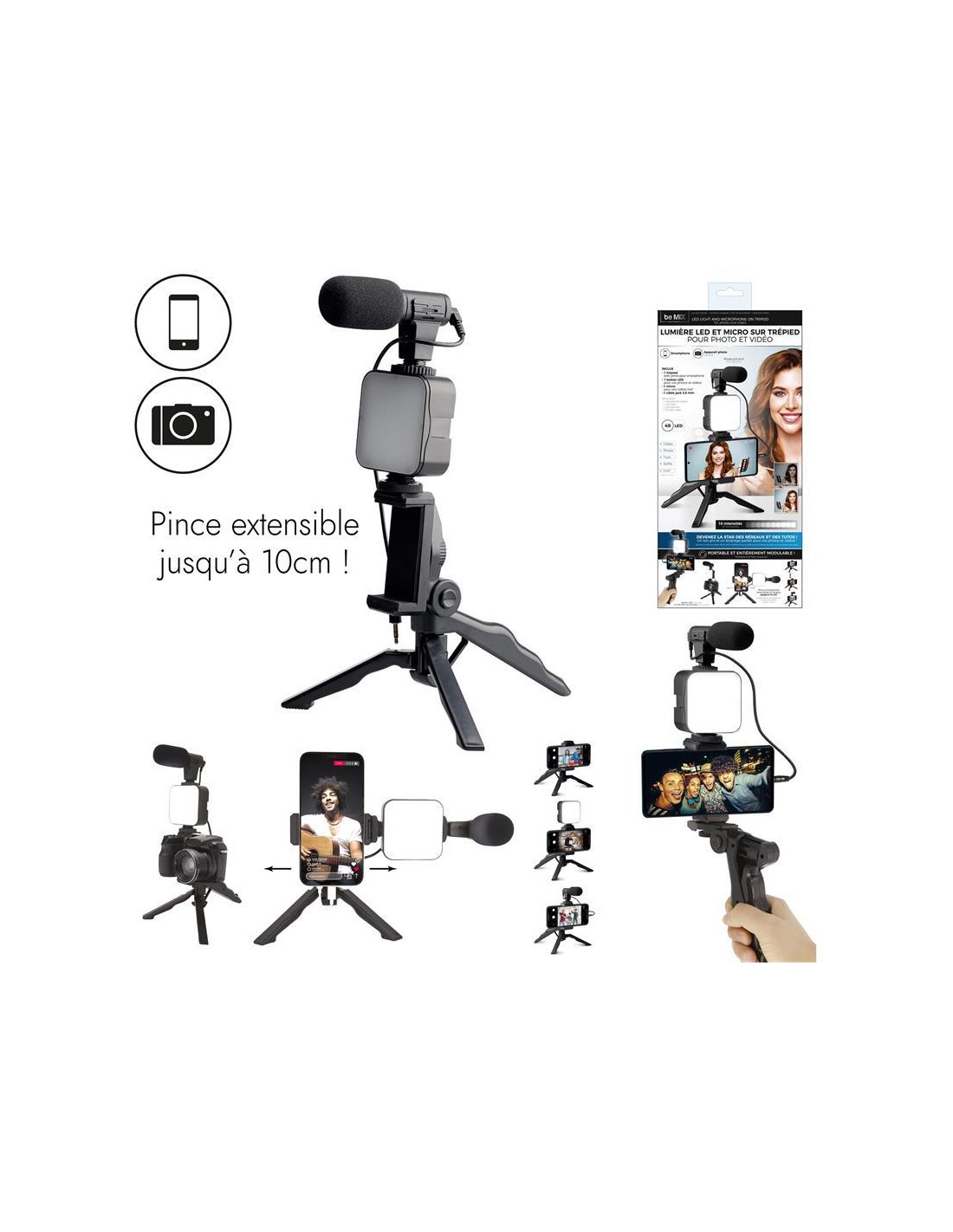 Vivez un instant musical et lumineux gréce é cette lumiére LED Karaoke sur trépied télescopique ! - 7 couleurs au choix - 8 jeux de lumiére - Effet stroboscope - 1 pince pour smartphone pour se filmer - 1 pince pour smartphone pour choisir chanson et paroles - raccordement USB - Composition : plastique