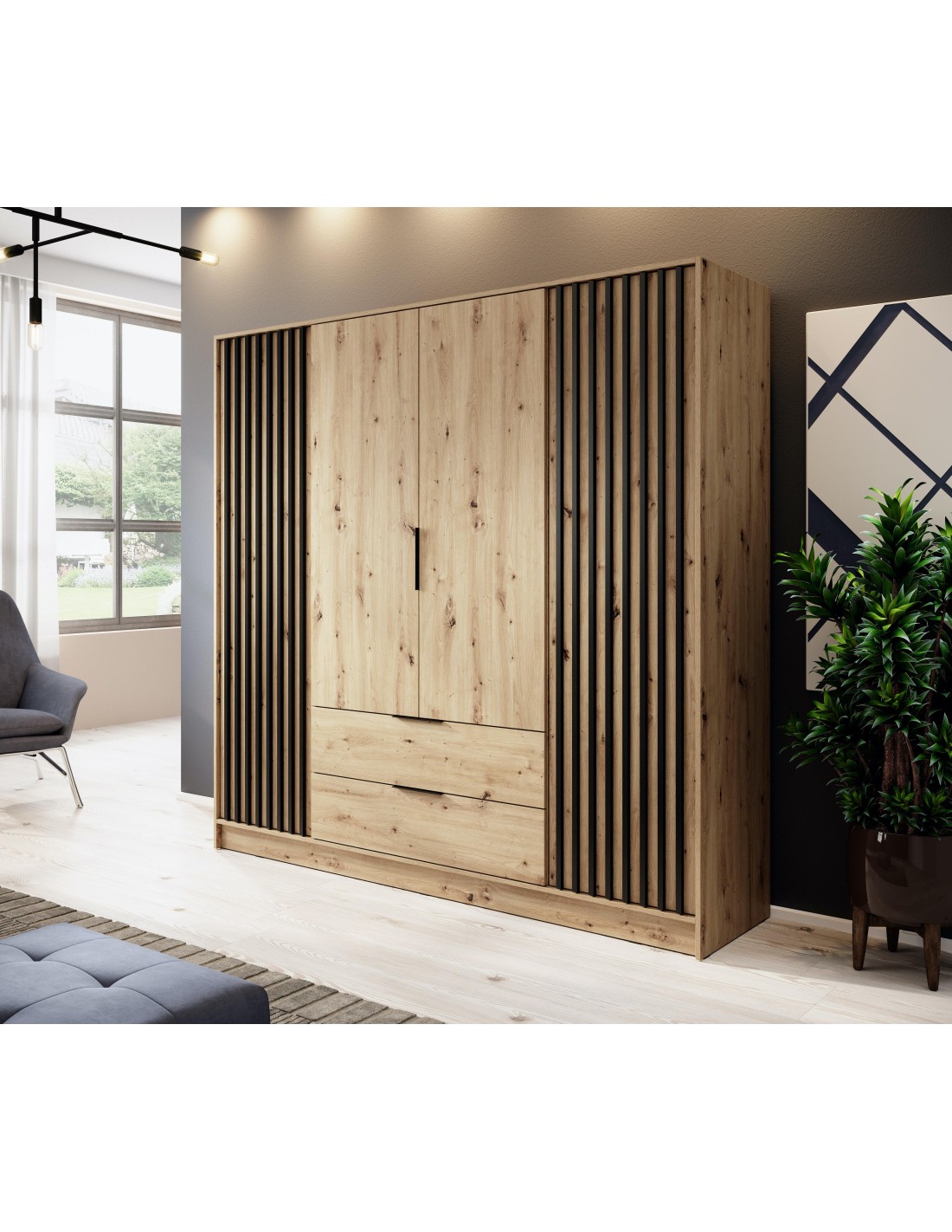 La collection 3D est la solution parfaite pour une chambre moderne. L'armoire spacieuse cache un miroir é l'intérieur et le lit avec un conteneur a une belle téte de lit irréguliére avec une étagére, un éclairage et des tables de chevet, le tout est complété par une commode spacieuse.Dimensions:- armoire - largeur 230 cm / hauteur 201,8 cm / profondeur...