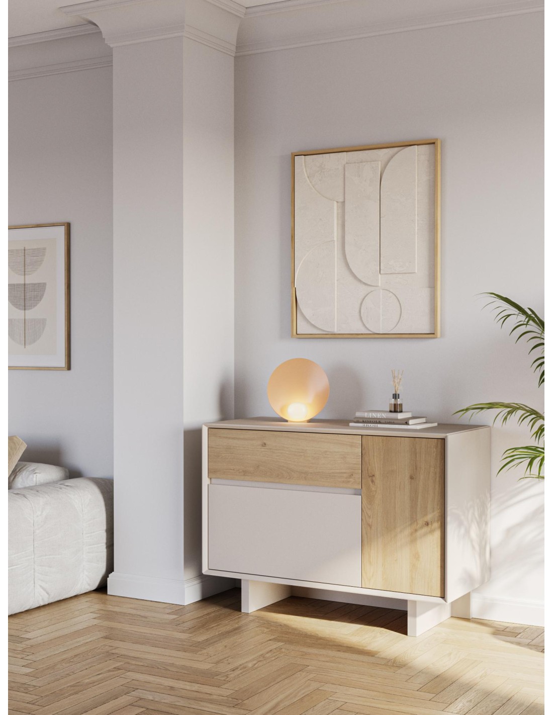Le buffet DAMA est composé de 2 portes, 2 tiroirs et 1 étagére en verre - panneau de fibre moyenne densité (MDF) épaisseur 22 mm - finition laquée blanc - DIM : 181x43x84 cm