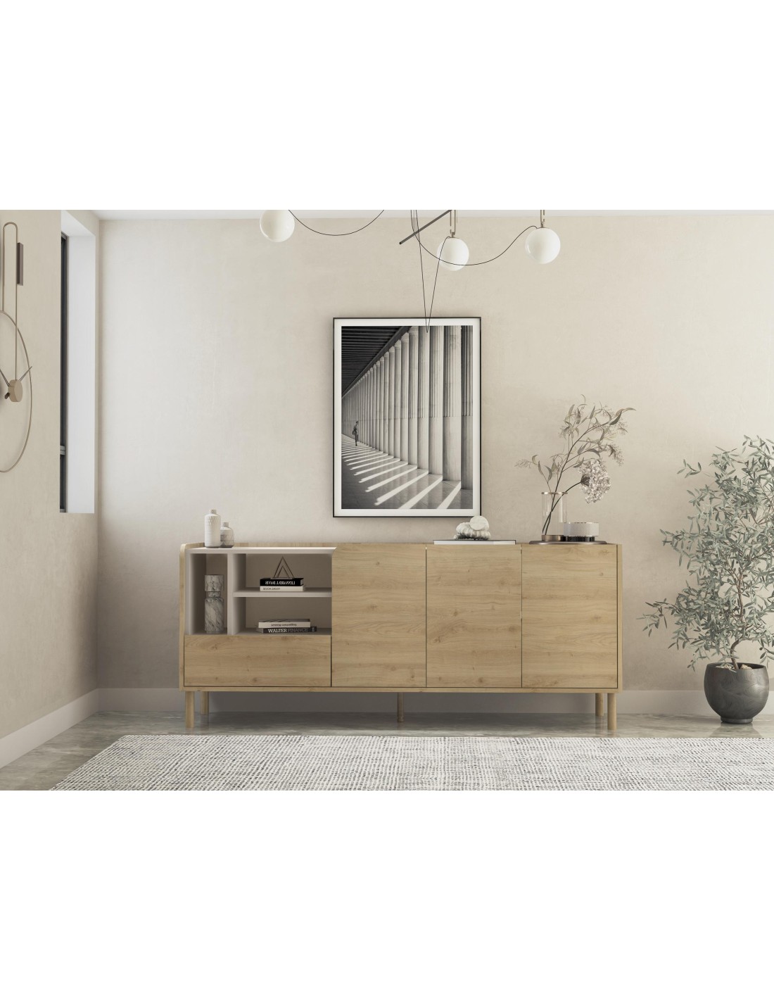 Rangez avec style dans votre salon ou dans votre chambre gréce é ce buffet KLAUS ! Sublimez la présentation de vos livres et de vos objets décoratifs avec ce buffet design en bois au style brut et naturel. Il posséde 3 portes pour y ranger vos effets personnels et sera du plus bel effet dans votre intérieur !Format du produit 100 x 140 x 35Composition 1...