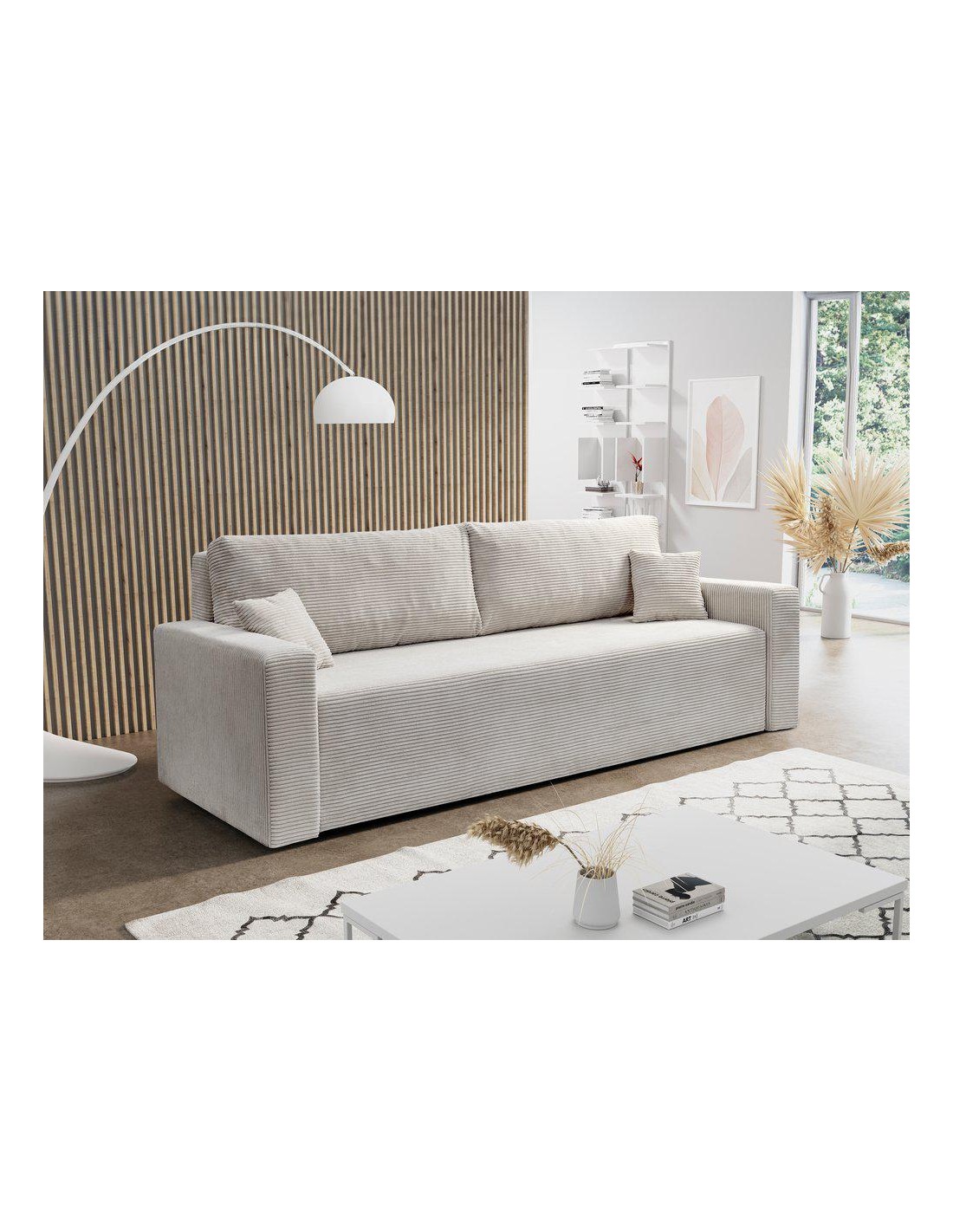 Canapé droit 3 places convertible. Structure en Pin / Hétre et panneaux de particules. Pieds en PVC. Matiére du rembourrage Mousse PU densité 28 kg/m3. Dim. : 230 x 94 x 75 cm.