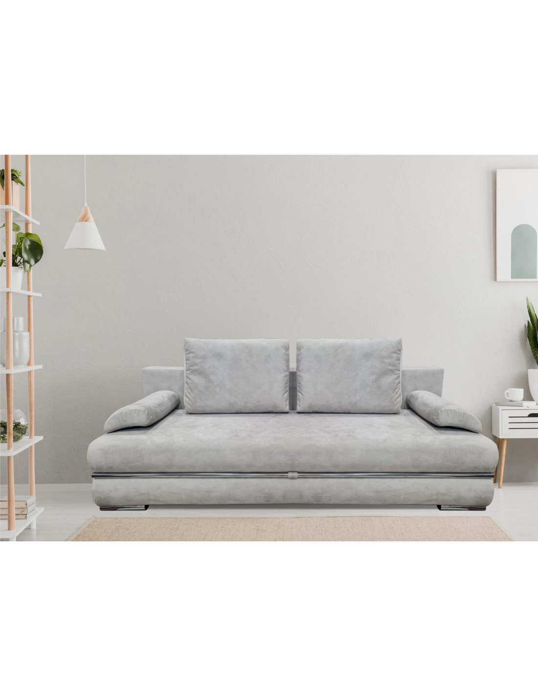 Canapé droit 3 places convertible. Structure en Pin / Hétre et panneaux de particules. Pieds en PVC. Matiére du rembourrage Mousse PU densité 28 kg/m3. Dim. : 230 x 94 x 75 cm.