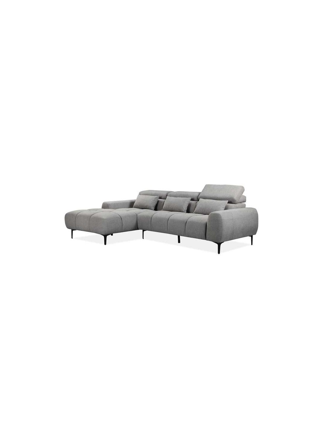 L.236 x P.85 x H.85 cm.Inclus coffre de rangement et 2 poufs.Canapé dangle 3 placesStructure en bois de pin et panneaux de particulesAssises en caoutchouc mousse souple, densité 25 kg/m3Dossiers et accoudoirs remplis dun mélange de caoutchouc haché et de fibres.Revétement en tissu NIDO gris, type Aqualine.CONVERTIBLE !DISPONIBLE EN PLUSIEURS COLORIS...