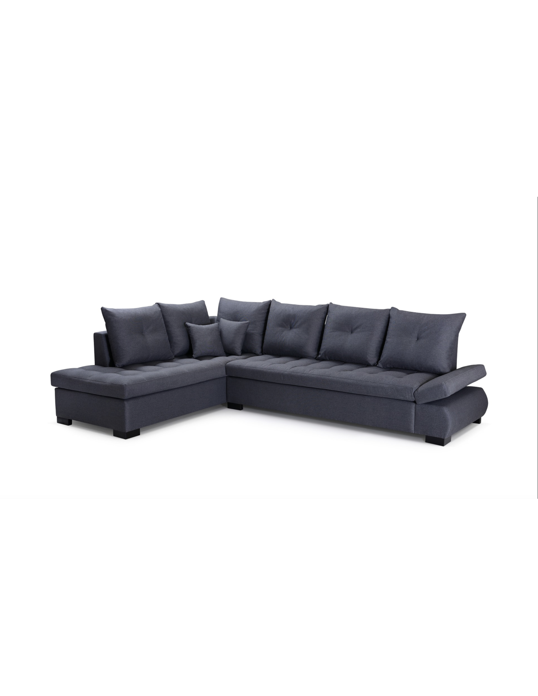 L.236 x P.85 x H.85 cm.Inclus coffre de rangement et 2 poufs.Canapé dangle 3 placesStructure en bois de pin et panneaux de particulesAssises en caoutchouc mousse souple, densité 25 kg/m3Dossiers et accoudoirs remplis dun mélange de caoutchouc haché et de fibres.Revétement en tissu NIDO gris, type Aqualine.CONVERTIBLE !DISPONIBLE EN PLUSIEURS COLORIS...