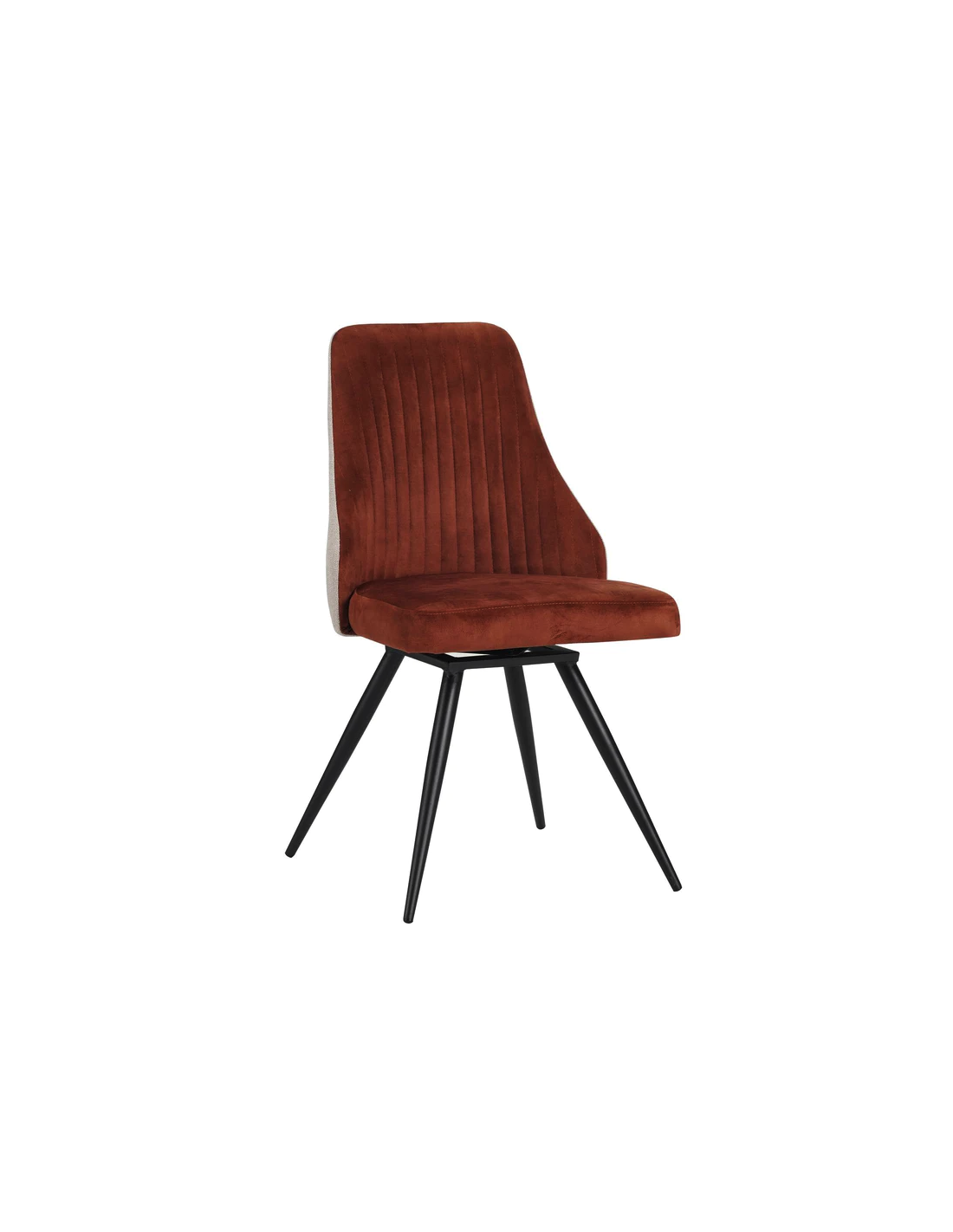 Chaise avec pieds en métal noir, assise et dossier rembourrés et revétement en tissu.