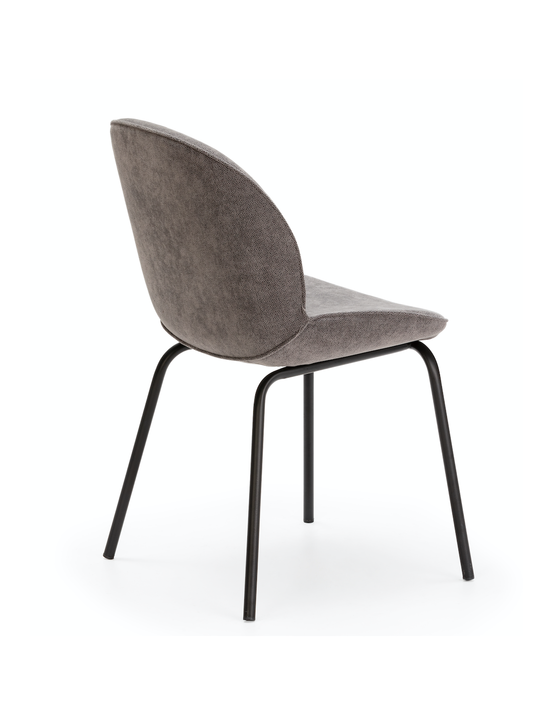 Chaise avec pieds en métal noir, assise et dossier rembourrés et revétement en tissu.