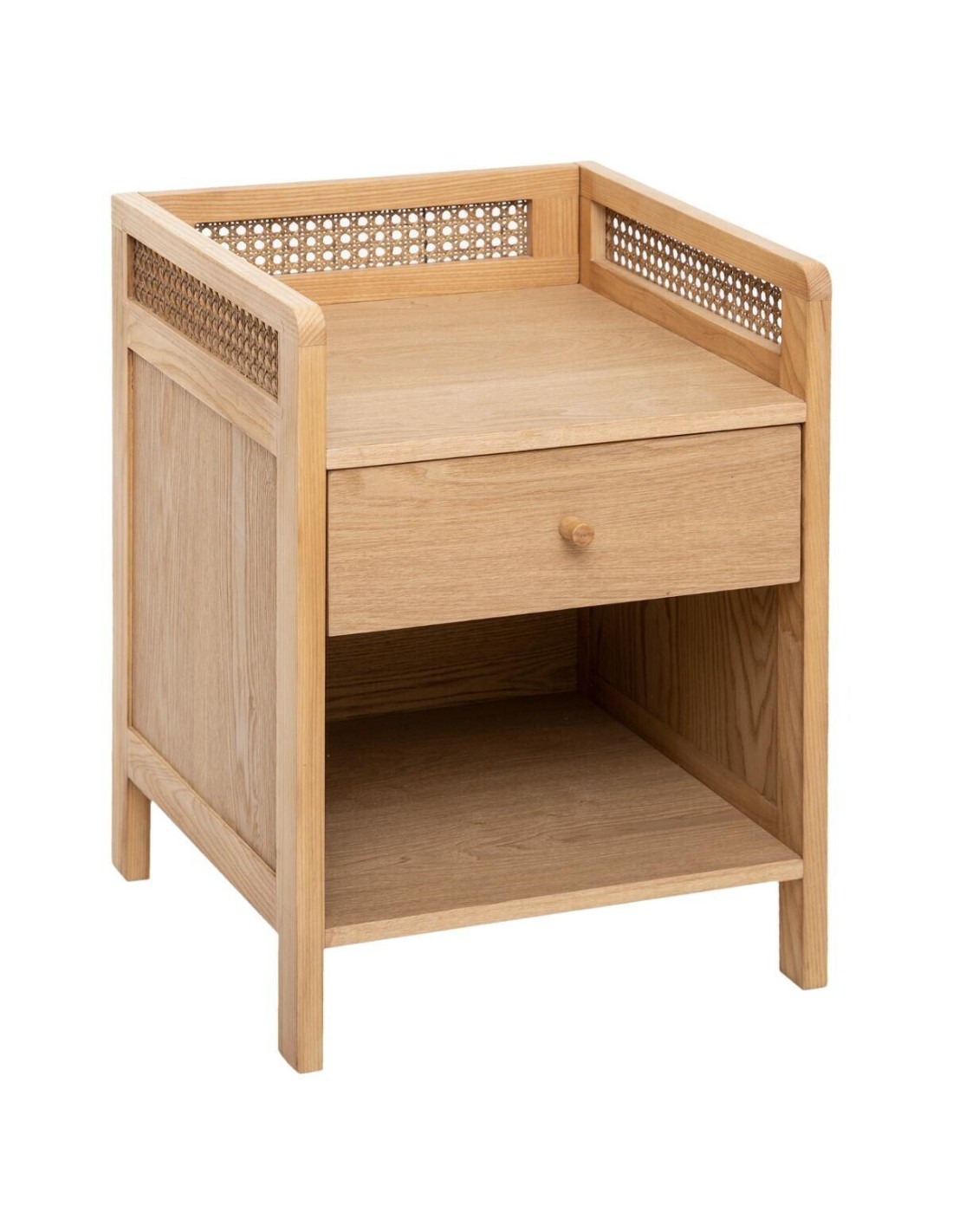Dimensions : L. 45 x P. 40 x H. 61 cmTiroir : L. 34 x l. 12,5 x P. 33 cmMatiére de la structure : MDF - Panneau de fibres de boisMatiére du placage : FréneMatiére des pieds : PinMatiére du tiroir cété : Panneau de particule-aggloméréMatiére de l'arriére : Papier