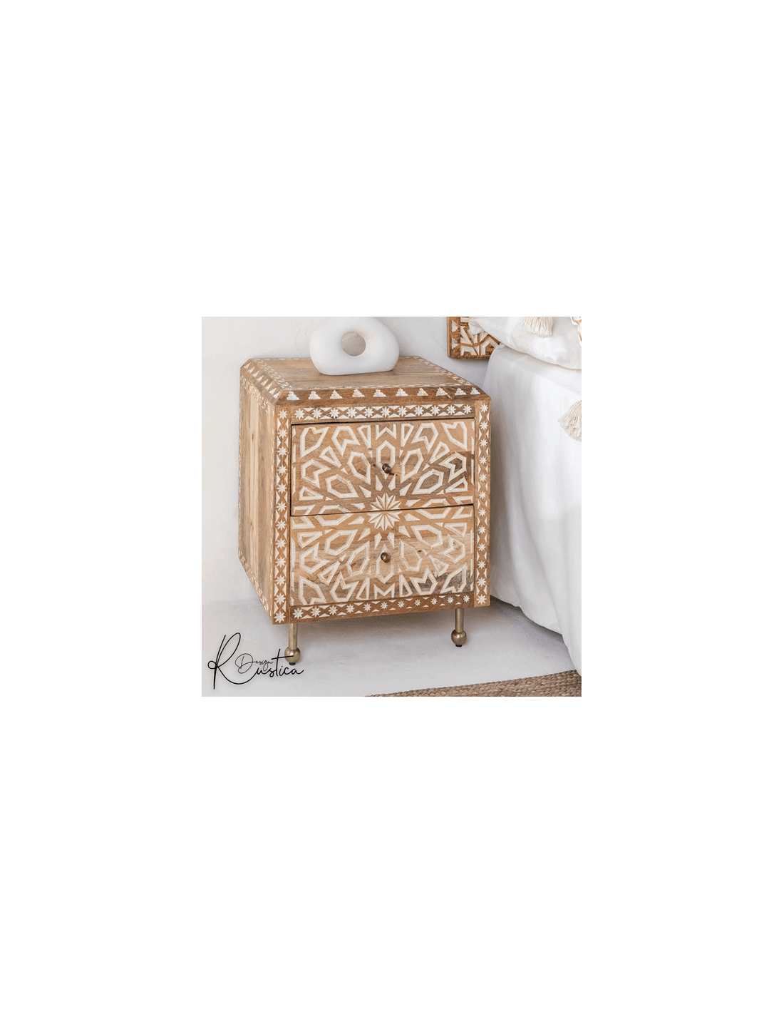 PETIT MEUBLE 2 TIROIRS. LIVRé MONTé. COLORIS BLANC ET NATUREL CéRUSé. EN BOIS MASSIF DE PAULOWNIA, BOIS TRéS LéGER ET FIBRES DE BOIS (MDF). DIMENSIONS 37X27 CM, HAUTEUR 48 CM