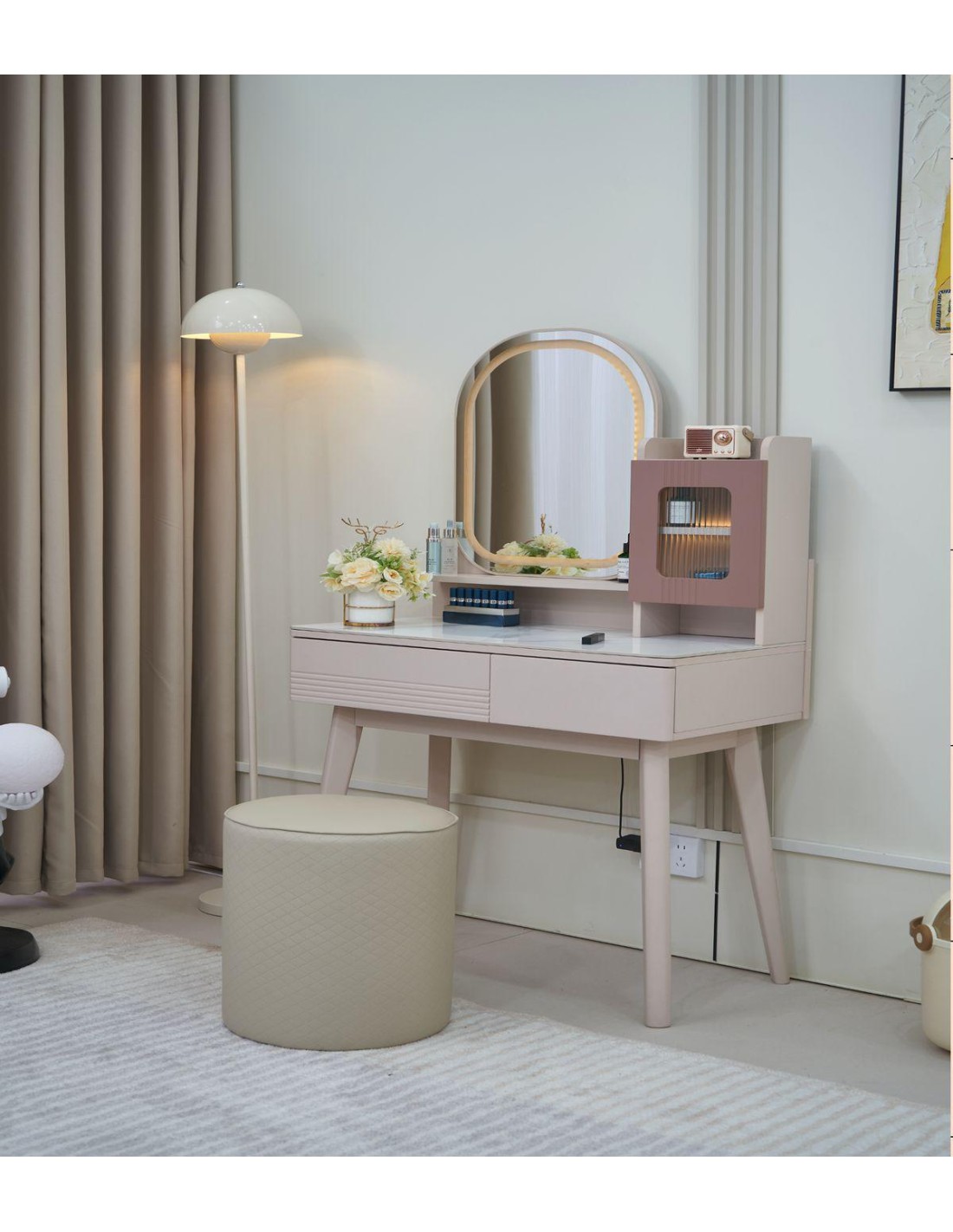 Coiffeuse moderne avec miroir LED et rangements intégrésOffrez-vous un espace beauté élégant et fonctionnel avec cette coiffeuse contemporaine. Son large miroir éclairé par un bandeau LED crée une lumiére douce et homogéne, idéale pour le maquillage ou les soins quotidiens.Avec ses lignes épurées et son design raffiné, elle s'intégre parfaitement é tous les intérieurs. Son grand plateau effet marbre accueille vos accessoires tandis que ses tiroirs et étagéres pratiques gardent tout é portée de main et bien organisé.Le petit meuble vitré intégré ajoute une touche déco originale tout en offrant un espace de rangement supplémentaire. Accompagnée de son tabouret assorti pour un confort optimal, cette coiffeuse est la piéce incontournable pour sublimer votre chambre ou votre dressing.? Miroir lumineux LED intégré? Plan de travail spacieux et facile é nettoyer? Tiroirs et étagéres pour un rangement optimisé? Design moderne et élégant? Tabouret assorti inclusTransformez votre rituel beauté en un véritable moment de plaisir?!Coiffeuse moderne avec miroir LED et rangements intégrésOffrez-vous un espace beauté élégant et fonctionnel avec cette coiffeuse contemporaine. Son large miroir éclairé par un bandeau LED crée une lumiére douce et homogéne, idéale pour le maquillage ou les soins quotidiens.Avec ses lignes épurées et son design raffiné, elle s'intégre parfaitement é tous les intérieurs. Son grand plateau effet marbre accueille vos accessoires tandis que ses tiroirs et étagéres pratiques gardent tout é portée de main et bien organisé.Le petit meuble vitré intégré ajoute une touche déco originale tout en offrant un espace de rangement supplémentaire. Accompagnée de son tabouret assorti pour un confort optimal, cette coiffeuse est la piéce incontournable pour sublimer votre chambre ou votre dressing.? Miroir lumineux LED intégré? Plan de travail spacieux et facile é nettoyer? Tiroirs et étagéres pour un rangement optimisé? Design moderne et élégant? Tabouret assorti inclusTransformez votre rituel beauté en un véritable moment de plaisir?!