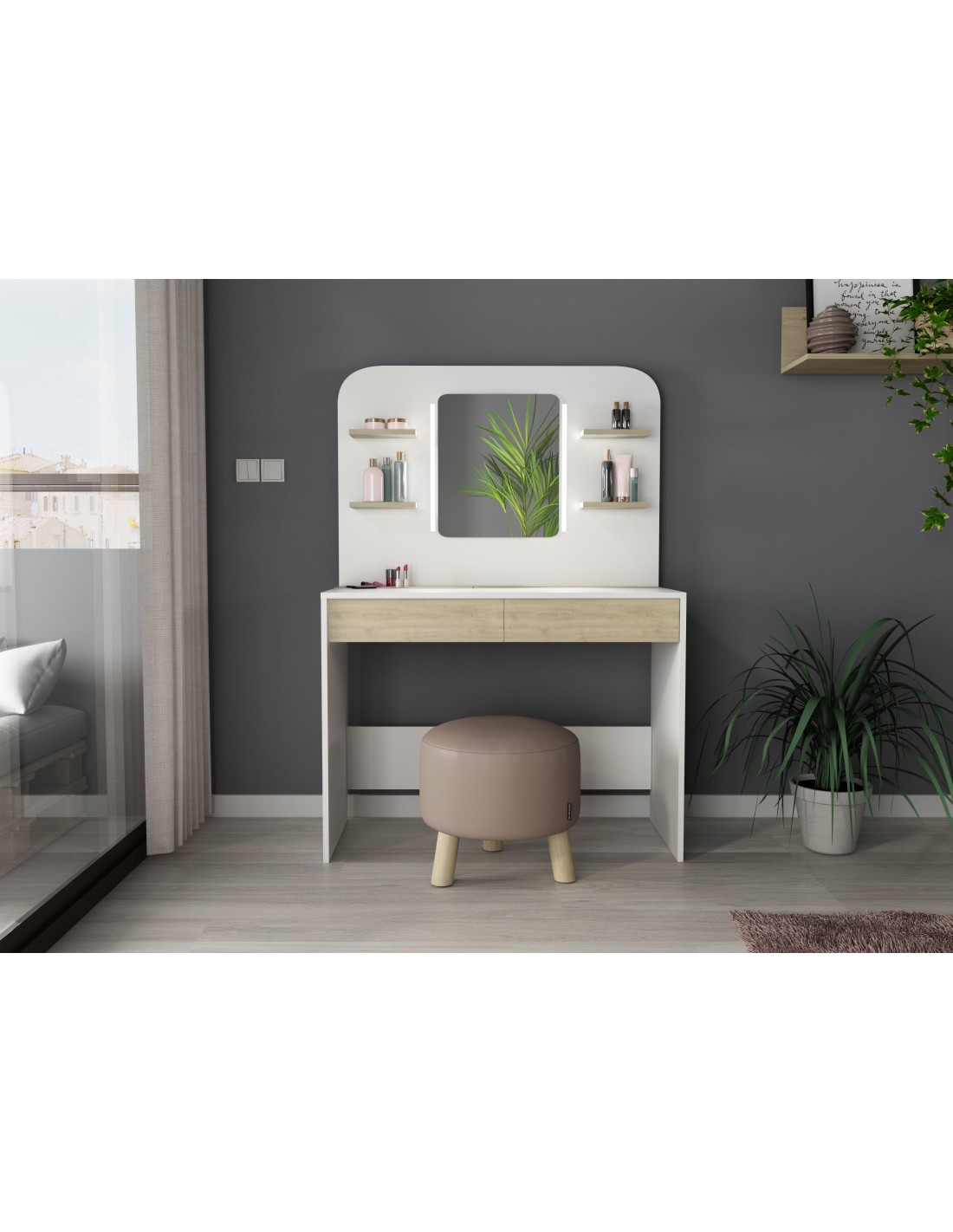 Vendu avec miroir et tabouret. Structure en panneau de particules mélaminé recouvert de papier décor oak.Dimension :80 x 40 x H125 cmVendu avec miroir et tabouret.Structure en panneau de particules mélaminé recouvert de papier décor oak.Dimension :80 x 40 x H125 cm