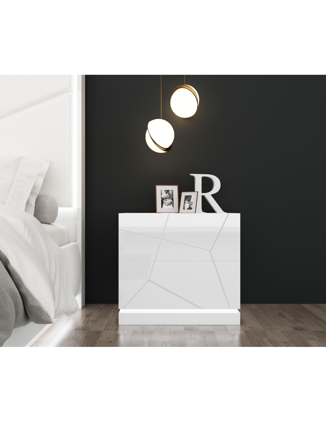 La chambre SALVADOR ajoute une ambiance contemporaine audacieuse é votre espace de sommeil. Laque Blanche avec Accents Miroir.Doté de lignes horizontales propres et téte de lit éclairée offrent un look moderne qui vous fait sentir comme é la maison.Dimensions:Lit bois laqué blanc avec sommier 14 lattes: 170x209.2x118 CMChevet 2 tiroirs bois laqué blanc...