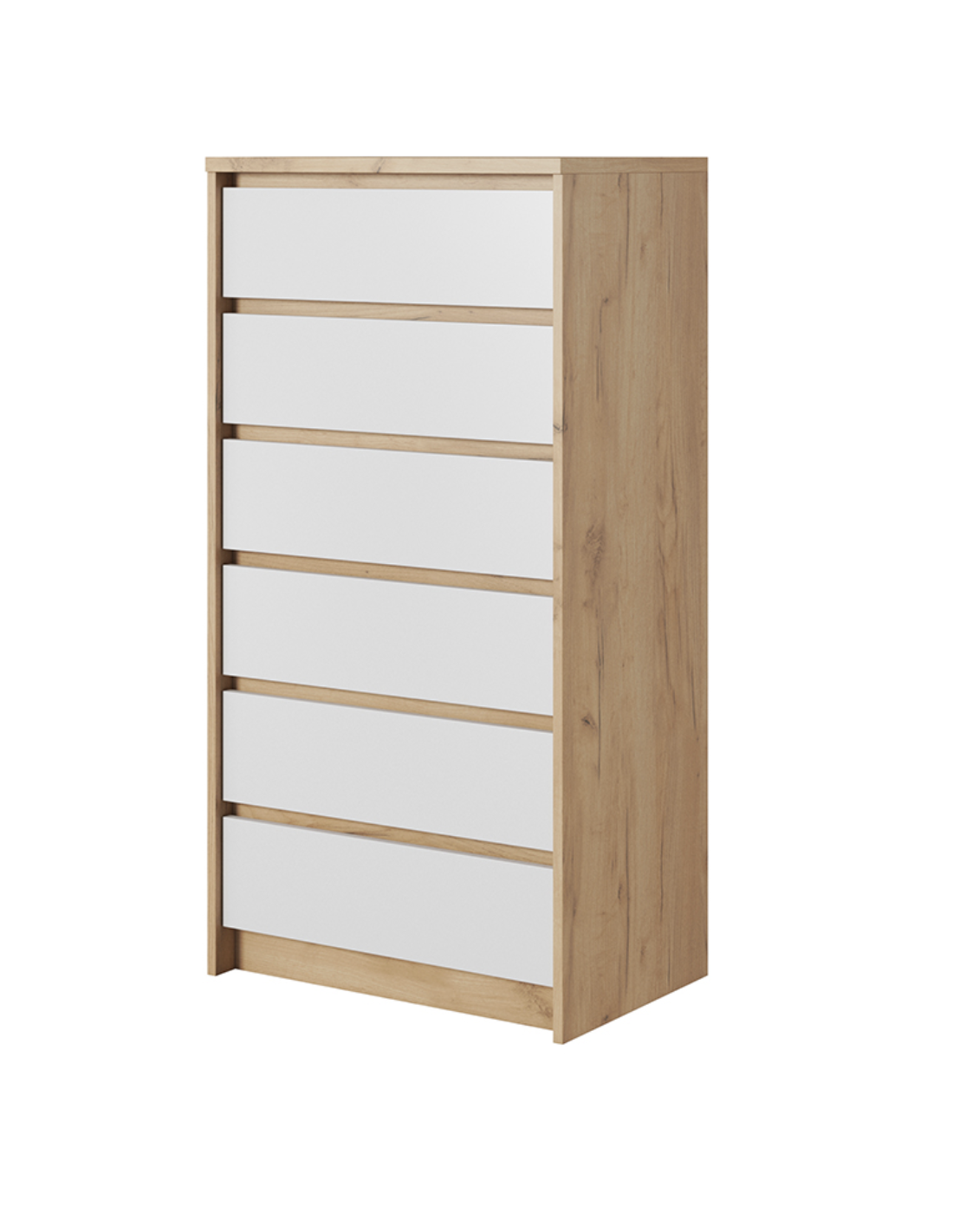 MALWA 140 CM est une commode élégante conéue pour le rangement. Le meuble est équipé de deux rangées de tiroirs symétriques gréce auxquels la commode a une capacité et une fonctionnalité supérieures é la moyenne. La profondeur optimale de chaque tiroir permet de ranger é la fois de petits accessoires et des articles plus volumineux. L'utilisation...