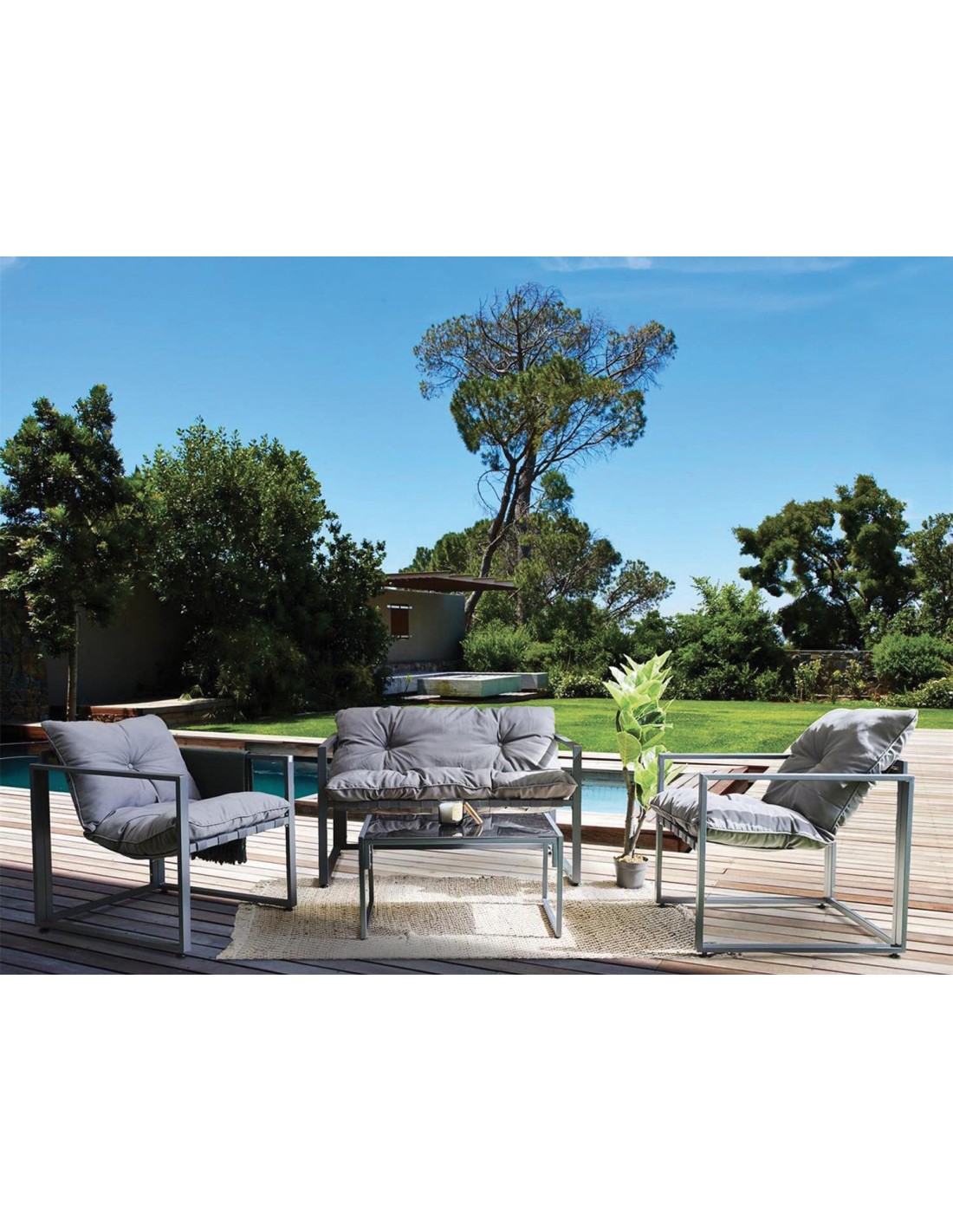 DimensionsL. 77 x P. 74 x H. 125 cmDimensions des fauteuils : L. 74 x l. 71 x H. 77 cmDimensions sofa 2 places : L. 74 x l. 125 x H. 77 cmDimensions de la table basse : L. 94 x l. 41 x 34 cmPoids31 kgMatiére de la structure :Acier traité époxyGrammage (g/m2) :250 g/m2Nombre de places :4Notice fournie :NonHousse compatible :Housse Hambo (Réf....
