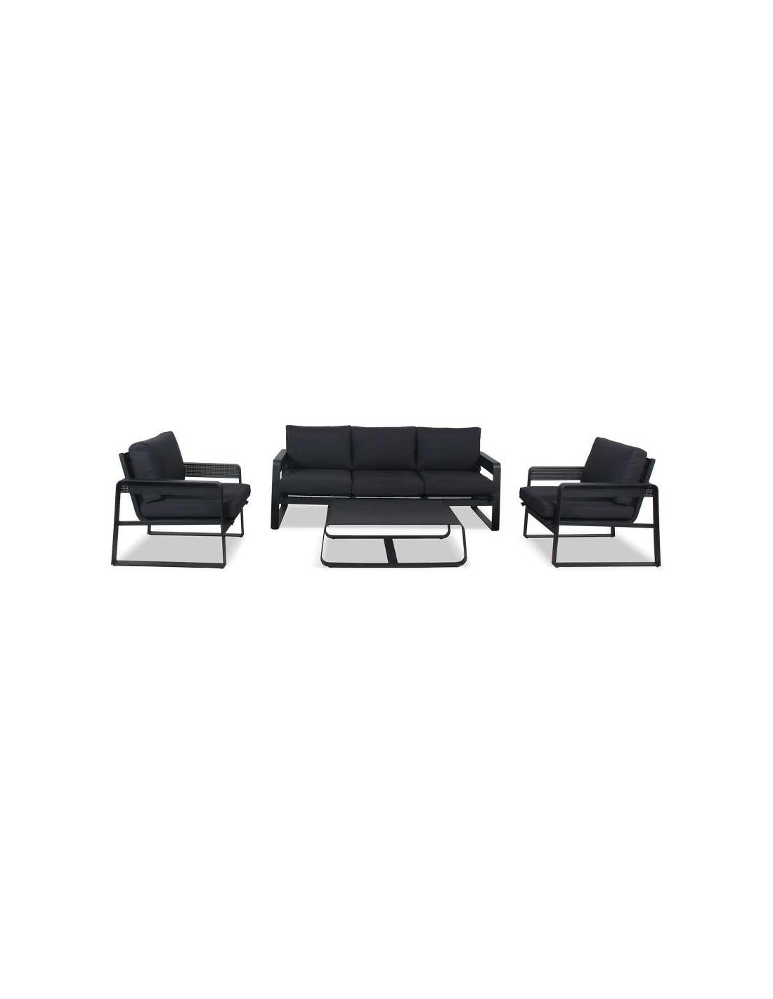 Dimensions Fauteuil ( x 2) : L. 77,5 x P. 71 x H. 65 cmCanapé 3 places : L. 190 x P. 71 x H. 65 cmTable basse : L. 87 x P. 87,3 x H. 38 cmMatiére de la structure AluminiumMatiére du coussinPolyesterMatiére du plateau Aluminiumé monter soi-méme OuiType de traitement Peinture époxyGrammage 230 g/méPoids maximal autorisé par personne 110 kgCoussins déco...