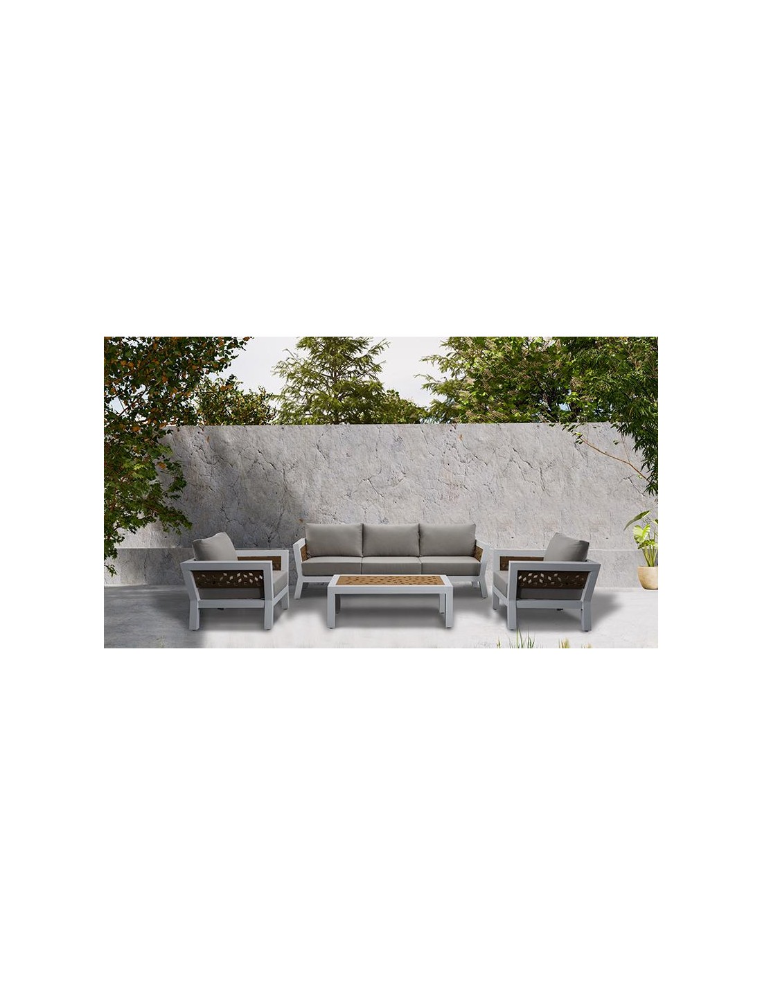 Dimensions1 canapé : L. 230,5 x l. 85 x H. 65 cm (47 kg)2 fauteuils : L. 95,5 x l. 85 x H. 65 cm (23 kg)1 table : L. 140 x l. 72 x H. 36 cm (17 kg)Matiére de la structure Aluminium traité époxyMatiére du plateau Aluminium traité époxy avec un effet bois peint é la mainé monter soi-méme OuiNombre places 5Déhoussable OuiPoids 110 kgGarantie 2 ans OuiMatiére...