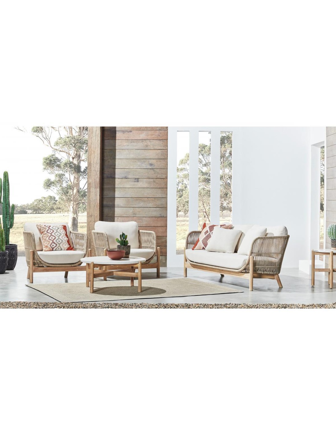 Dimensions2 fauteuils : L. 112 x P. 98,5 x H. 83 cm1 canapé 3 places : L. 210 x P. 101 x H. 83 cm1 table : D. 90 x H. 39 cmAssise : 44 cmHauteur assise sans coussin : 35 cmHauteur d'assise avec coussin : 42 cmMatiére de la structure Aluminium traité époxyMatiére coussin PolyesterMatiére du plateau Aluminium traité époxyMatiére de l'habillage Résine...