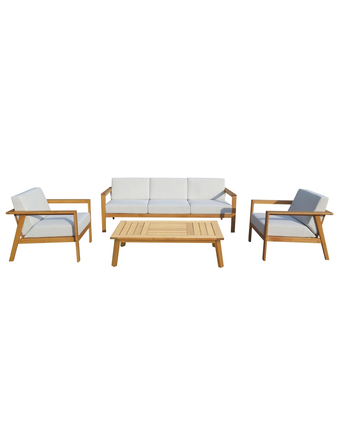 Nombre de places:5Matériau du cadre : Bois d'eucalyptusMatériau du plateau de table: GRCMatériau du cadre du siége: Aluminium, CordeTapisserie Polyester water deperlanMatériau de remplissage du coussin :Fibre, MousseHauteur du produit (cm) 3 places : 82,5 | Fauteuil : 82,5 | Table basse : 38Largeur du produit (cm) 3 places : 193 | Fauteuil : 69,5 | Table...