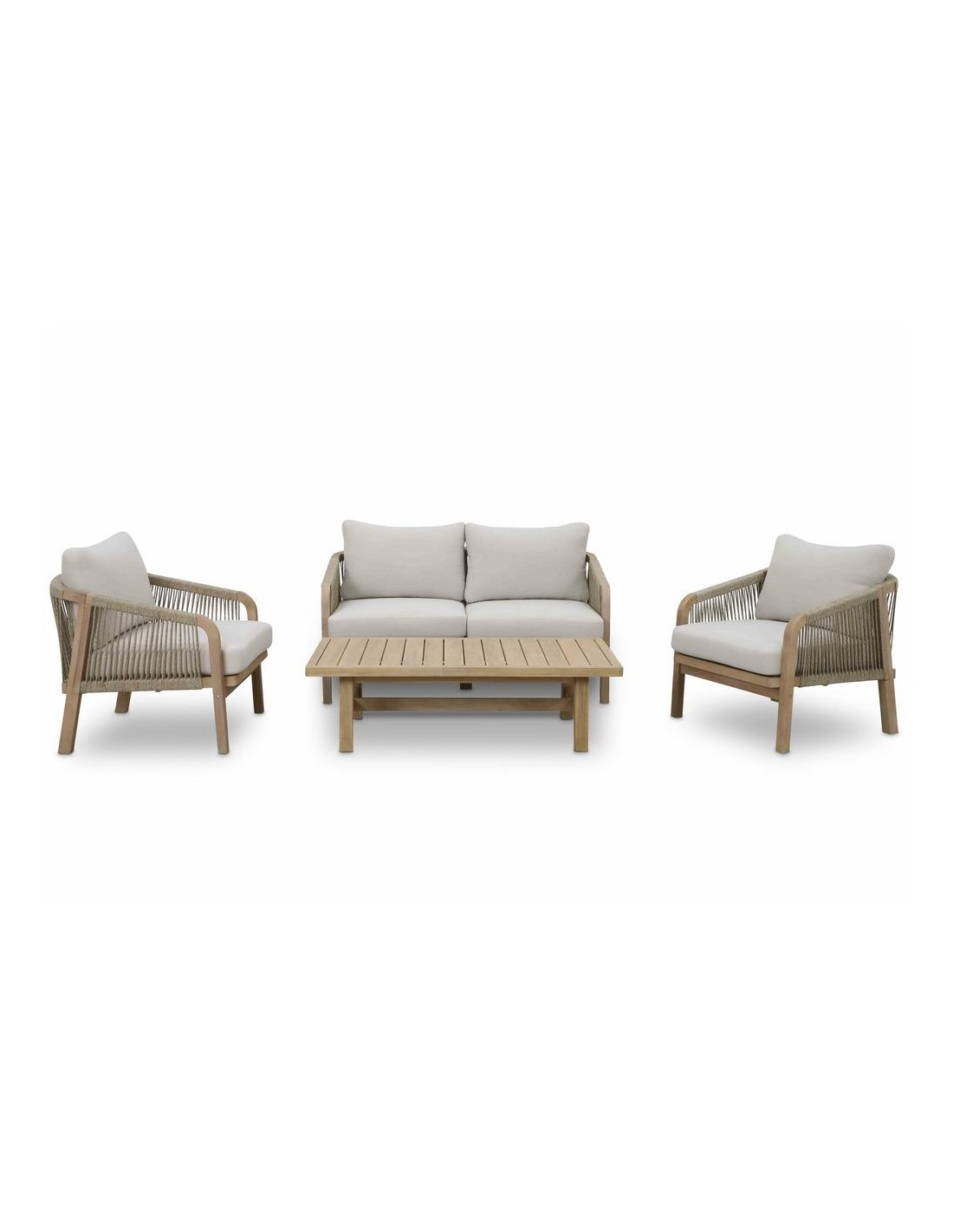 L'ensemble de jardinRIMINI 4 PLACES est fabriqué en bois d'acacia de couleur claire et en corde de polyester tresséee é la main. le bois est certifié par l'organisation fsc. Il provient de foréts durables pour contribuer é la préservation de l'environnement. ce salon se compose d'une table basse (h 36 x l 127 x pr 65 ), de 2 fauteuils (h 68.5 x l 79 x pr 73 ) et d'un canapé 2 places (h 68.5 x l 138 x pr 79 ). Les coussins beiges ont des housses amovibles pour un lavage facile. vous pouvez combiner l'ensemble avec d'autres produits de la gamme RIMINI.
