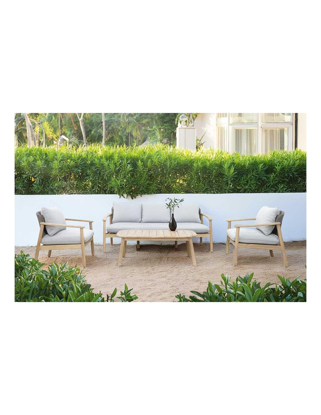 DimensionsFauteuil ( x 2) : L. 84 x P. 75 x H. 65 cm (2 x 16,9 kg)Canapé 3 places : L. 204 x P. 75 x H. 65 cm (34,9 kg)Table Basse : L. 118 x P. 62 x H. 40 cm (12,1 kg)Hauteur d'assise : 23 cm sans coussin et 40 cm avec coussinHauteur d'accoudoir : 65 cmMatiére de la structure AluminiumMatiére du coussin OléfineMatiére du plateau Résine PlastiqueMatiére...
