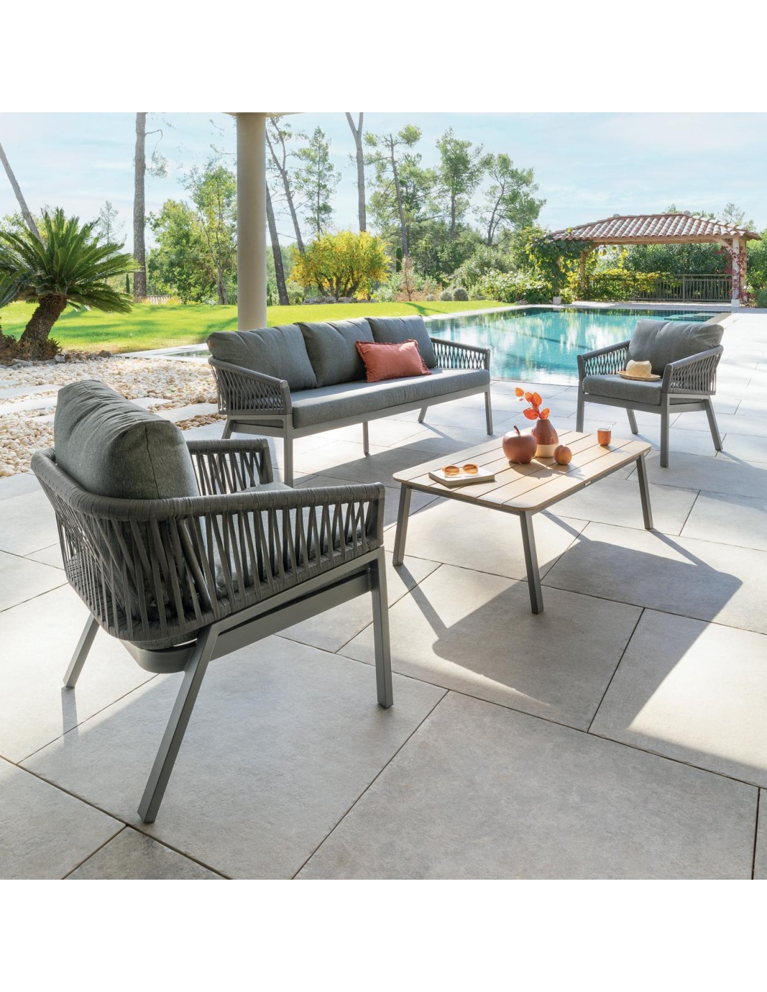 Dimensions : Canapé (cm) : L. 174,5 x P. 75,5 x H. 80Table (cm) : L. 110 x P. 55 x H. 40Fauteuil (cm) : L. 66 x P. 75,5 x H. 80Coussins d'assise (cm) : 55 x 55 x 6Coussins dossier (cm) : 55 x 55 x 6Hauteur assise canapé sans coussin (cm) : 36,5Hauteur d'assise canapé avec coussin (cm) : 44,5Matiére de la structure : Aluminium traité époxyMatiére de...