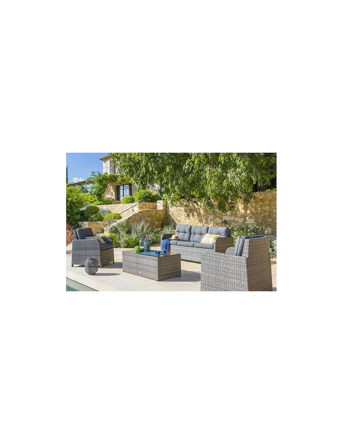 Dimensions : Canapé (cm) : L. 174,5 x P. 75,5 x H. 80Table (cm) : L. 110 x P. 55 x H. 40Fauteuil (cm) : L. 66 x P. 75,5 x H. 80Coussins d'assise (cm) : 55 x 55 x 6Coussins dossier (cm) : 55 x 55 x 6Hauteur assise canapé sans coussin (cm) : 36,5Hauteur d'assise canapé avec coussin (cm) : 44,5Matiére de la structure : Aluminium traité époxyMatiére de l'habillage : Résine synthétique tresséeMatiére du plateau : VerreMatiére du tissu : PolyesterNombre de places : 5Traitement anti-rouille époxy : OuiCoussin(s) déhoussable(s) : OuiDimensions :Canapé (cm) : L. 174,5 x P. 75,5 x H. 80Table (cm) : L. 110 x P. 55 x H. 40Fauteuil (cm) : L. 66 x P. 75,5 x H. 80Coussins d'assise (cm) : 55 x 55 x 6Coussins dossier (cm) : 55 x 55 x 6Hauteur assise canapé sans coussin (cm) : 36,5Hauteur d'assise canapé avec coussin (cm) : 44,5Matiére de la structure : Aluminium traité époxyMatiére de l'habillage : Résine synthétique tresséeMatiére du plateau : VerreMatiére du tissu : PolyesterNombre de places : 5Traitement anti-rouille époxy : OuiCoussin(s) déhoussable(s) : Oui