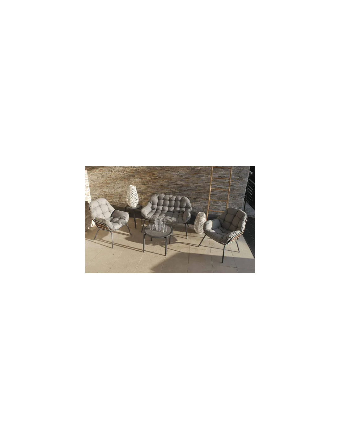 SALON 5 PLACESFauteuil 85 x 80 x 64cmCanapé 3 places : 225 x 80 x 65 cmTable : 122 x 77 x 32 cmMatiére de la Structure:Fauteuils & Canapé Aluminium traité époxy Tissu déperlantSALON 5 PLACESFauteuil 85 x 80 x 64cmCanapé 3 places : 225 x 80 x 65 cmTable : 122 x 77 x 32 cmMatiére de la Structure:Fauteuils & Canapé Aluminium traité époxy Tissu...