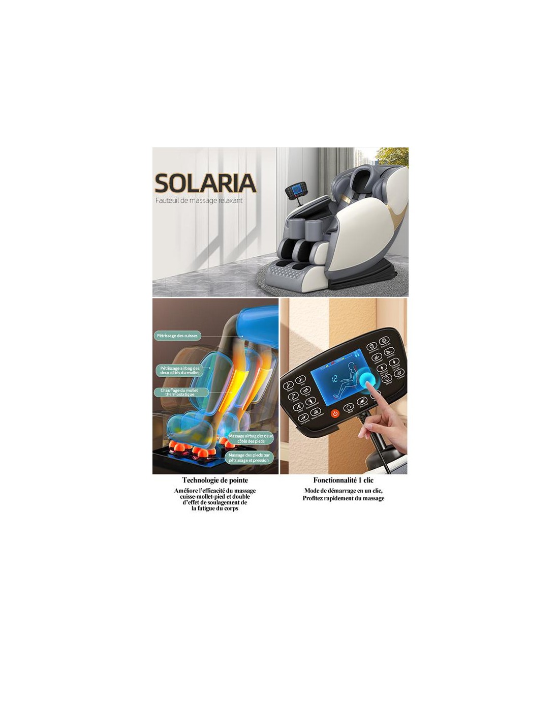 TELECOMMANDE A ECRAN TACTILE A CONTROLERMASSAGE SHIATSU DE LA NUQUE ET DES EPAULESMECANISME INTELLIGENTDIMENSIONS ASSISE 72 X 140 X 105CMDIMENSION COUCHER 170 X 76CMTELECOMMANDE A ECRAN TACTILE A CONTROLERMASSAGE SHIATSU DE LA NUQUE ET DES EPAULESMECANISME INTELLIGENTDIMENSIONS ASSISE 72 X 140 X 105CMDIMENSION COUCHER 170 X 76CM