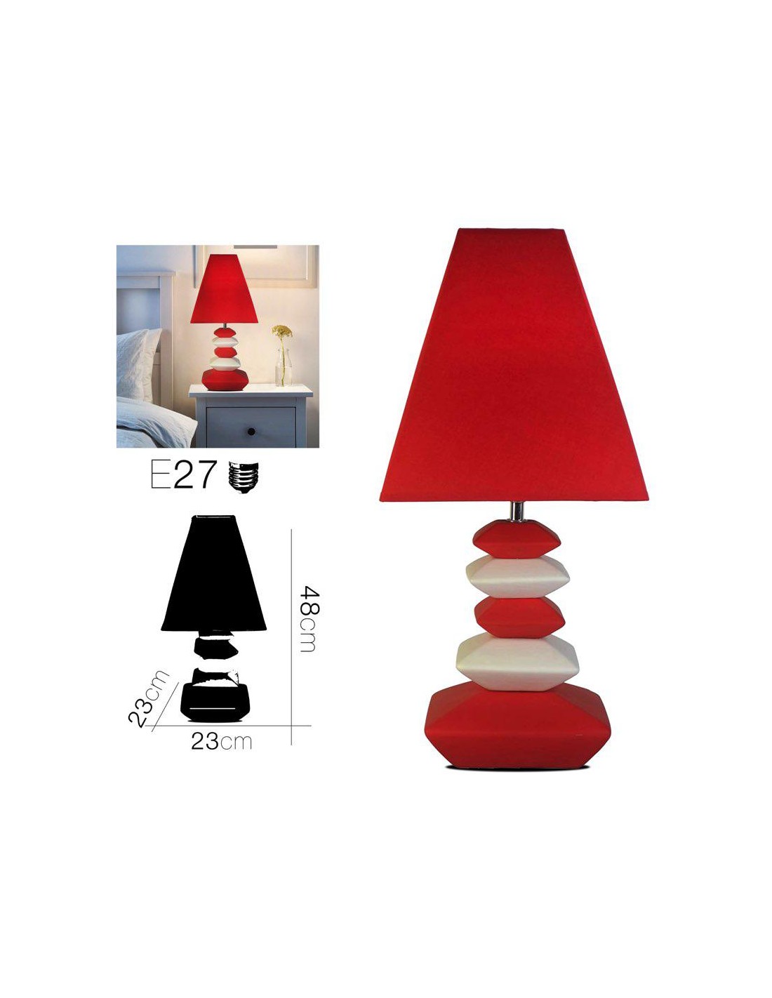 Dimension produit:éD. 21 x H. 38 cm Alimentation (secteur/batterie/port usb) : SECTEUR Détail dimensions:éAbat-jour : D. 19 x H. 13 cm Longueur céble : 150 cm. Ampoule incluse : NON. Puissance max : 25W. Douille : E15