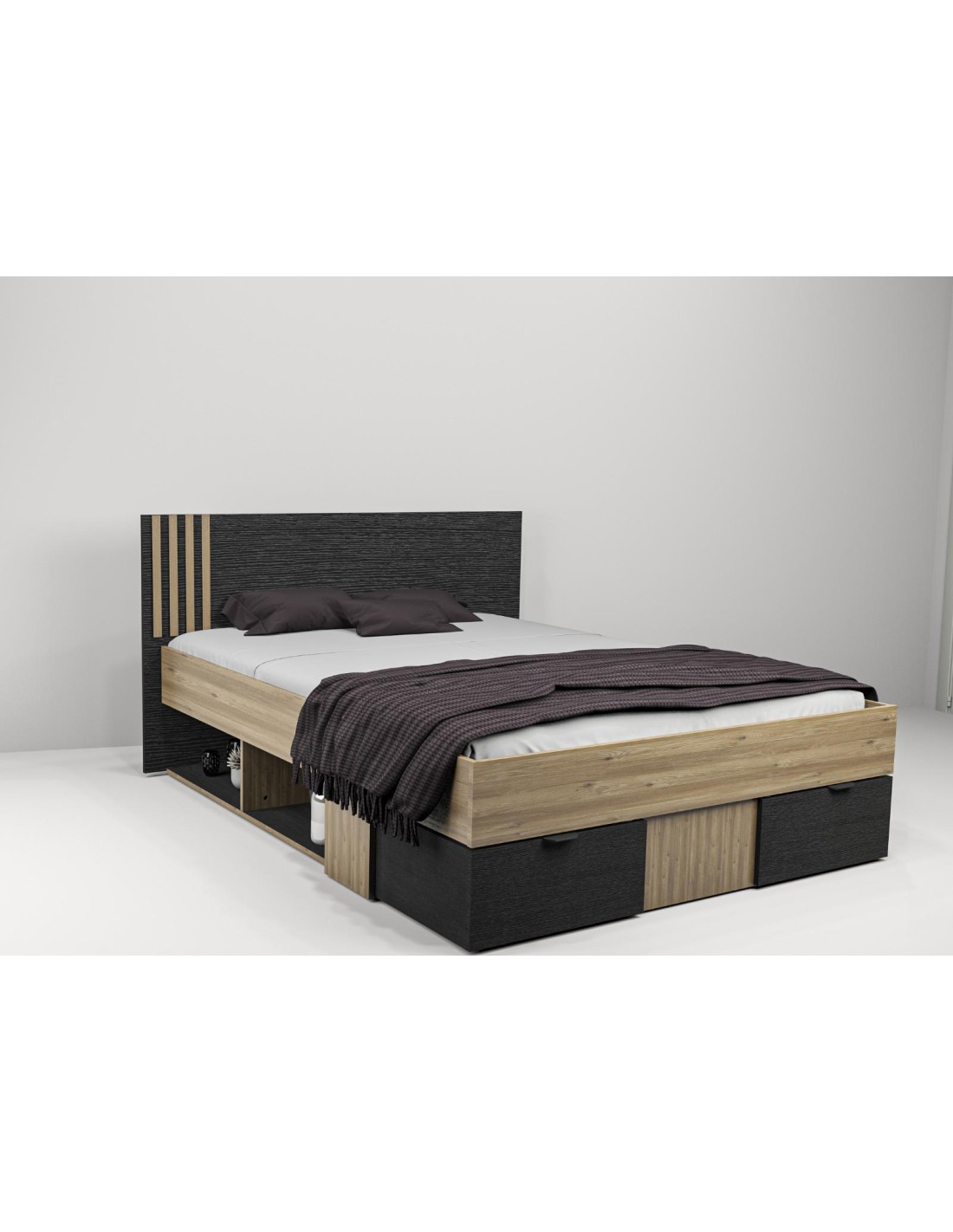 Structure en bois mélaminé bi-ton avec niches de rangement sur le cété du lit et 2 tiroirs.Disponible pour matelas en 140 x 190 cm (Dim. : 197,6 x 160 x 95 cm) et en 160 x 200 cm (Dim. : 207,6 x 180 x 95 cm) dont 3,63é déco. part.Disponible en Noir / Chéne et Vision / Chéne .Vendue sans sommier.Structure en bois mélaminé bi-ton avec niches de rangement sur le cété du lit et 2 tiroirs.Disponible pour matelas en 140 x 190 cm (Dim. : 197,6 x 160 x 95 cm) et en 160 x 200 cm (Dim. : 207,6 x 180 x 95 cm) dont 3,63é déco. part.Disponible en Noir / Chéne et Vision / Chéne .Vendue sans sommier.