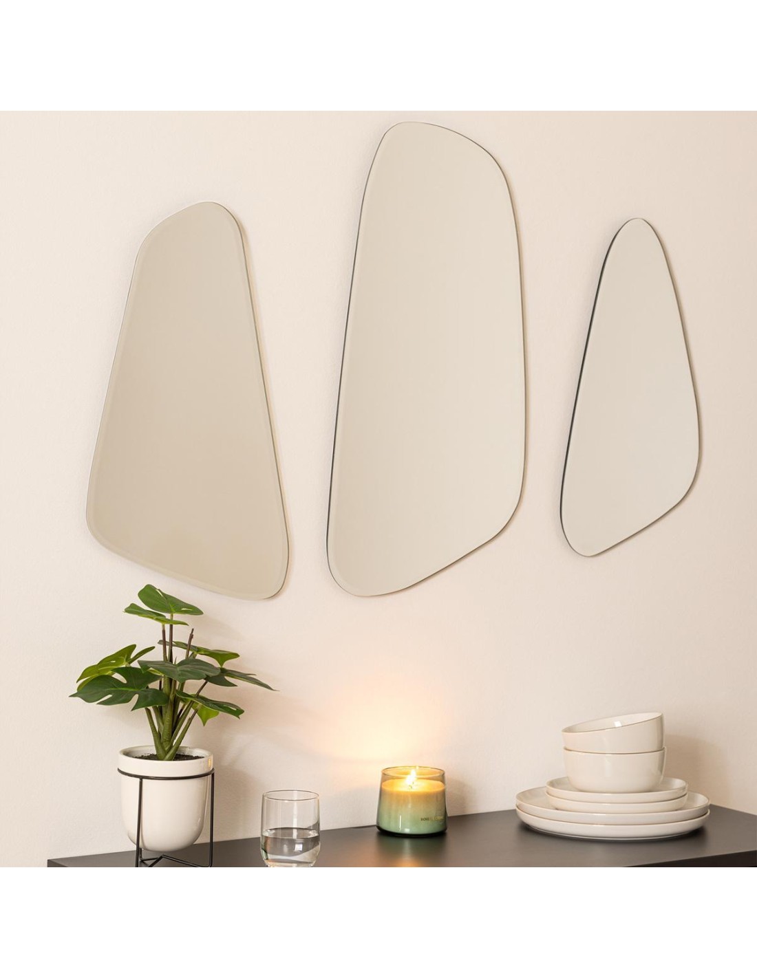 Miroir en verre poli sans distorsion, forme ondulée asymétrique au design organique, finition chant finement arrondi, livré avec son support en bois poser au sol ou avec son piétement en métal noir.Dimensions : 60x2xH160cmMiroir en verre poli sans distorsion, forme ondulée asymétrique au design organique, finition chant finement arrondi, livré avec son...
