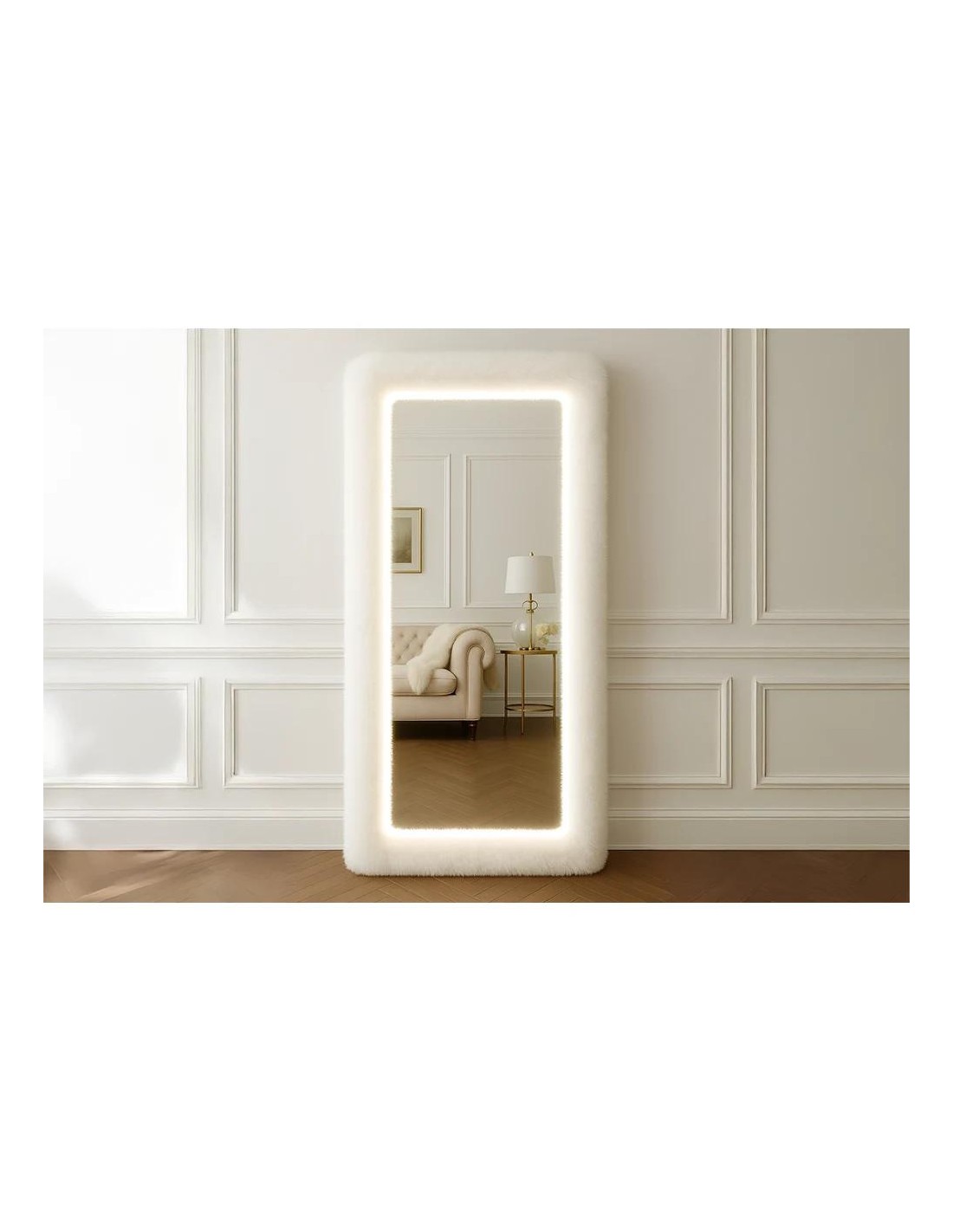 Structure en MDF recouverte de fourrure synthétique blanc,noir ou gris, éclairage LED 3 couleurs avec commande tactile intégré sur tout le pourtour intérieur du miroir. Finition douce et texturée, coins arrondis pour un design contemporain et chaleureux sur piétement en métal.Dimensions : hauteur 180x7x78cmStructure en MDF recouverte de fourrure synthétique blanc,noir ou gris, éclairage LED 3 couleurs avec commande tactile intégré sur tout le pourtour intérieur du miroir. Finition douce et texturée, coins arrondis pour un design contemporain et chaleureux sur piétement en métal.Dimensions : hauteur 180x7x78cm