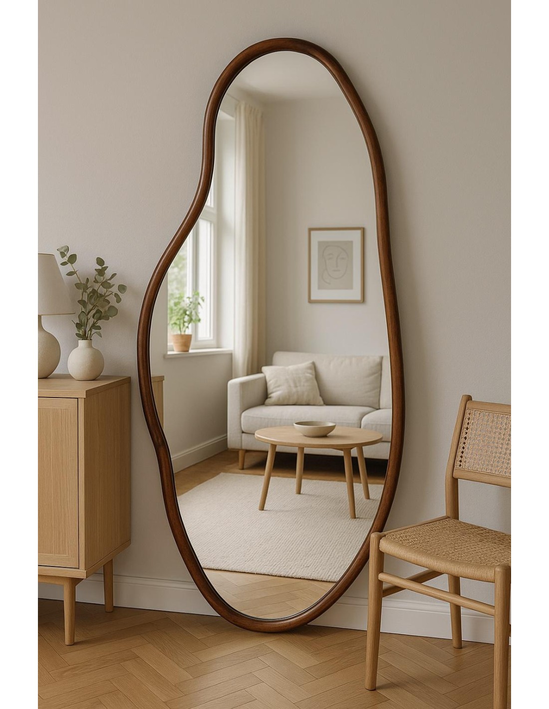 Miroir en verre poli sans distorsion, forme ondulée asymétrique au design organique, finition chant finement arrondi, livré avec son support en bois poser au sol ou avec son piétement en métal noir.Dimensions : 60x2xH160cmMiroir en verre poli sans distorsion, forme ondulée asymétrique au design organique, finition chant finement arrondi, livré avec son...