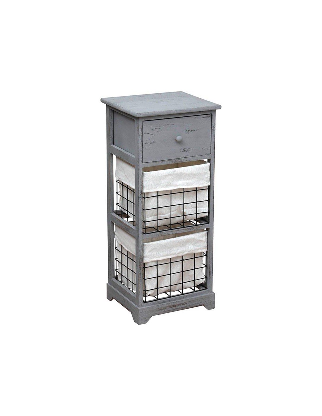 MEUBLE 3 TIROIRS. LIVRé MONTé. EN BOIS MASSIF DE PAULOWNIA (BOIS TRéS LéGER) ET FIBRES DE BOIS (MDF). COLORIS BLANC, GRIS ET DéCOR. DIMENSIONS 25X25 CM, HAUTEUR 77 CM.