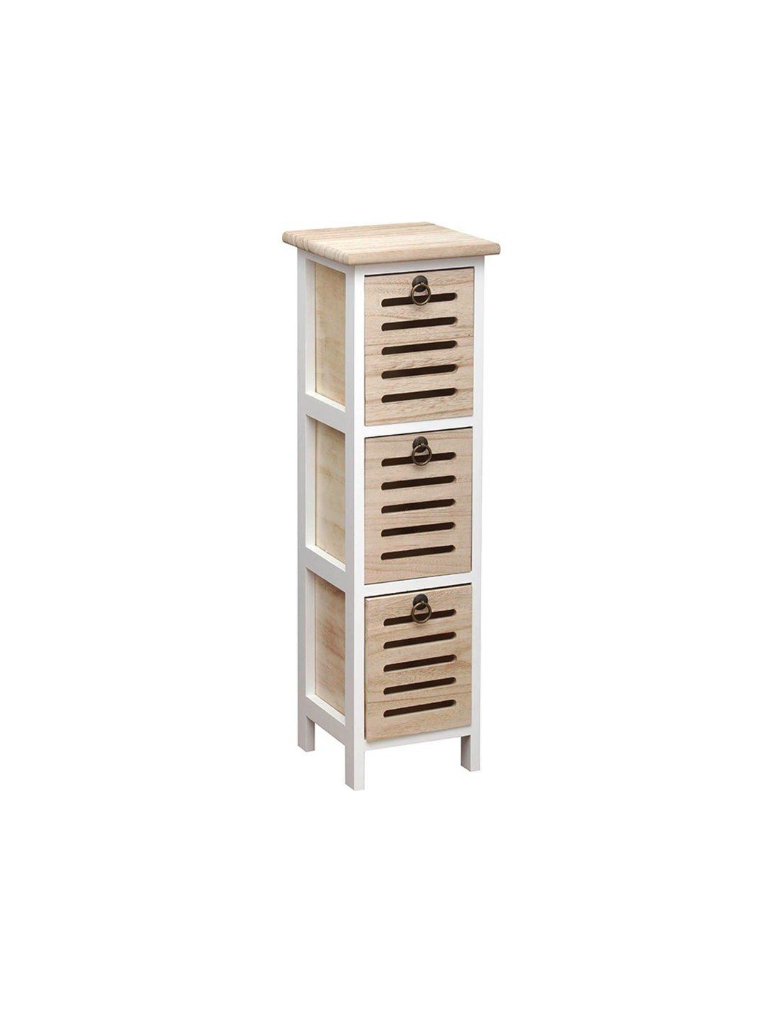 MEUBLE 3 TIROIRS. LIVRé MONTé. EN BOIS MASSIF DE PAULOWNIA (BOIS TRéS LéGER) ET FIBRES DE BOIS (MDF). COLORIS BLANC, GRIS ET DéCOR. DIMENSIONS 25X25 CM, HAUTEUR 77 CM.