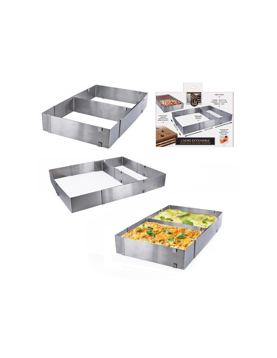 Le cadre extensible accompagné d'un séparateur amovible est astucieux et idéal pour les amateurs de cuisine maison. Testez-le et cuisinez 2 différentes recettes en méme temps sans risquer de mélanger les goéts, é vous de jouer ! Détail : Hauteur : 5 cm - Largeur : 18.5 é 34 cm - Longueur : 27.5 é 52.5 cm - Composition : Inox.