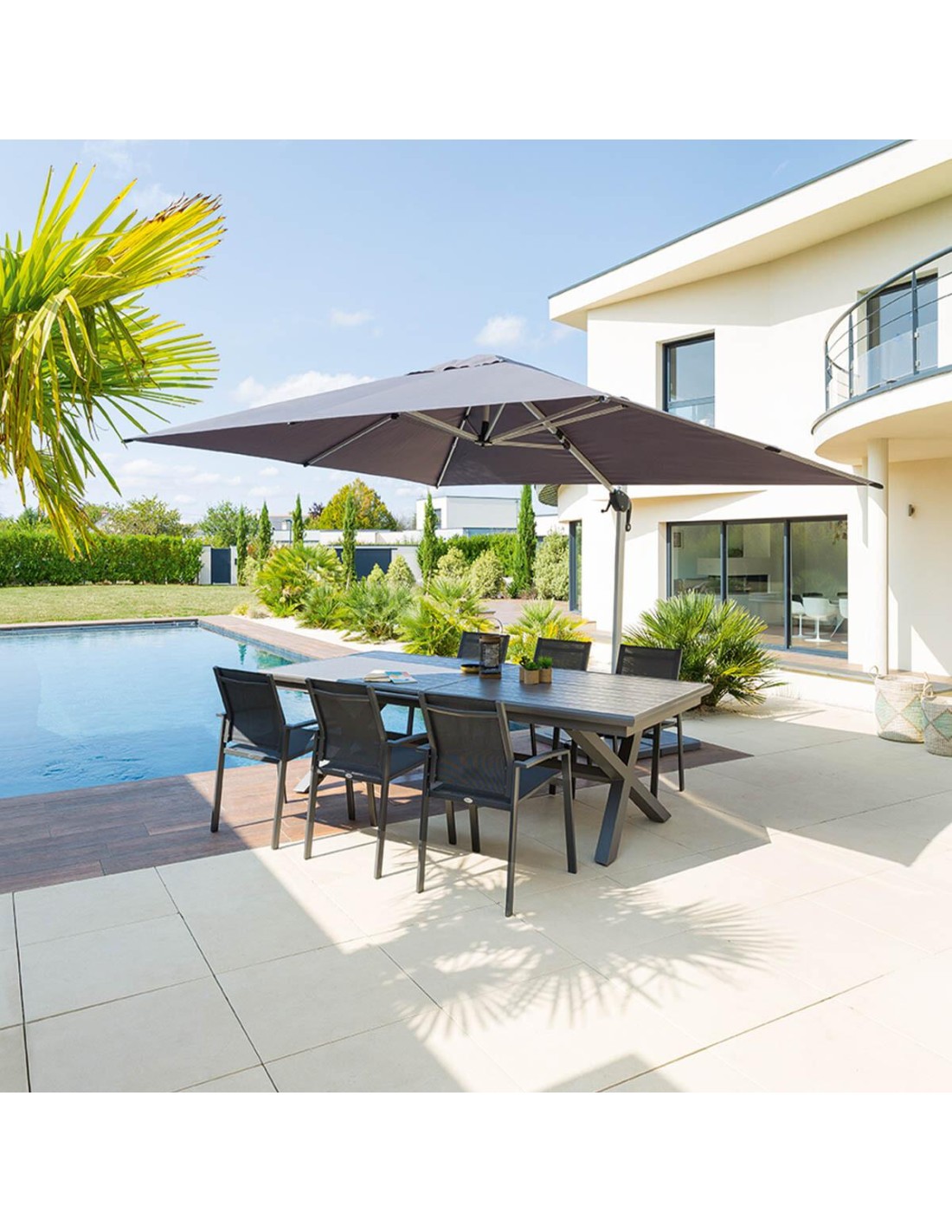 Conéu en aluminium, le parasol déporté "Equador" protégera votre extérieur du soleil avec style. Si le parasol est avant tout destiné é protéger du soleil, il est aussi un élément de décoration é part entiére ! Gréce é sa manivelle, les manoeuvres d'ouverture et de fermeture seront un jeu d'enfant. également inclinable et doté d'un systéme de rotation é 360 degrés, il vous offrira une protection optimale.Sa large toile en polyester traité déperlant sera idéale en cas de pluies légéres, tandis que sa cheminée d'aération limitera la prise au vent.L. 400 x P. 300 x H. 270 cm - Mét : 77 x 53 mmConéu en aluminium, le parasol déporté "Equador" protégera votre extérieur du soleil avec style.Si le parasol est avant tout destiné é protéger du soleil, il est aussi un élément de décoration é part entiére ! Gréce é sa manivelle, les manoeuvres d'ouverture et de fermeture seront un jeu d'enfant. également inclinable et doté d'un systéme de rotation é 360 degrés, il vous offrira une protection optimale.Sa large toile en polyester traité déperlant sera idéale en cas de pluies légéres, tandis que sa cheminée d'aération limitera la prise au vent.L. 400 x P. 300 x H. 270 cm - Mét : 77 x 53 mm