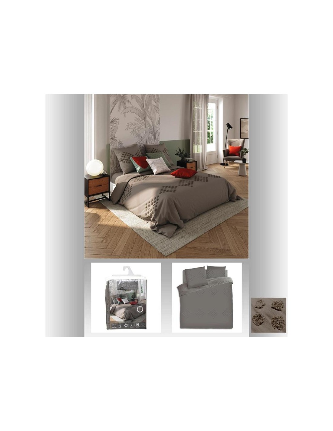 Dimension produit: L. 240 x P. 260 x H. 0,3 cm Détail dimensions: Taies d'oreillers : L. 65 x l. 65 x H. 0.3 cm Housse de couette : L . 240 x l. 260 x 0.3 cm Nombre de fils/cmé : 57 fils Type fermeture : Boutons Matiére: COTON
