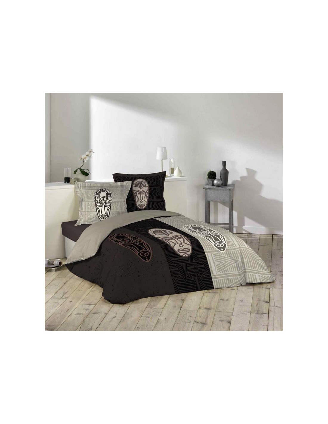 Dimension produit: L. 240 x P. 220 x H. 0,3 cm Détail dimensions: Taies d'oreillers : L. 65 x l. 65 x H. 0.3 cm Housse de couette : L . 220 x l. 240 x 0.3 cm Nombre de fils/cmé : 57 fils Type fermeture (boutons invisibles) : Bouton Matiére: COTON