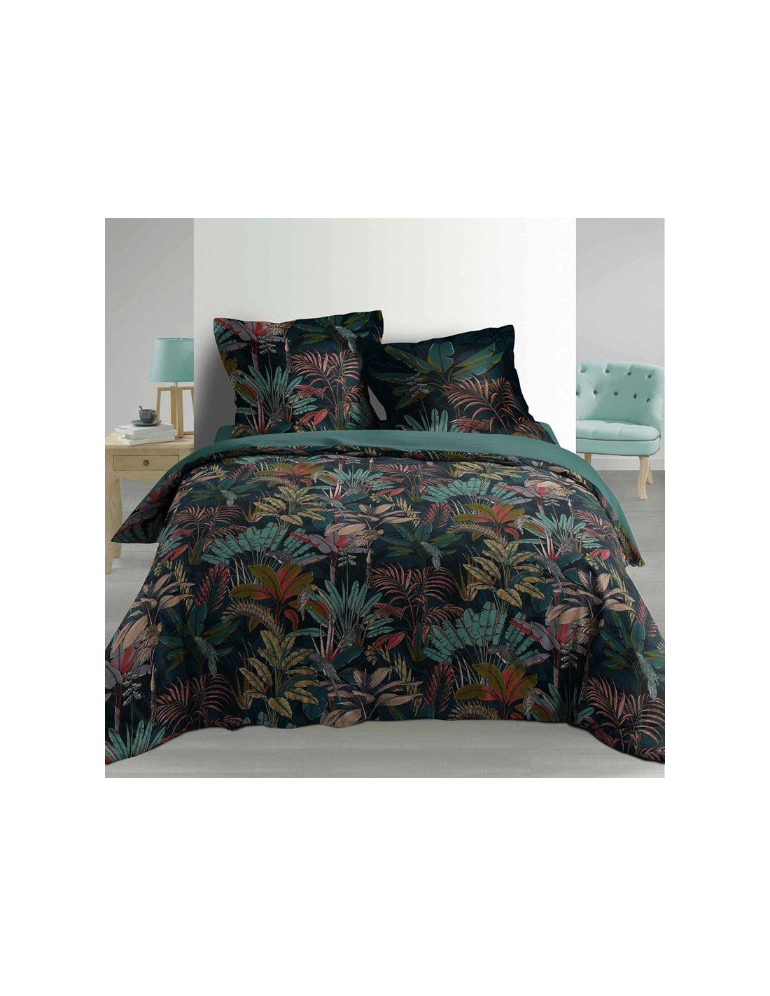 Dimension produit: L. 240 x P. 220 x H. 0,3 cm Détail dimensions: Taies d'oreillers : L. 65 x l. 65 x H. 0.3 cm Housse de couette : L . 220 x l. 240 x 0.3 cm Nombre de fils/cmé : 57 fils Type fermeture : Boutons Matiére: COTON