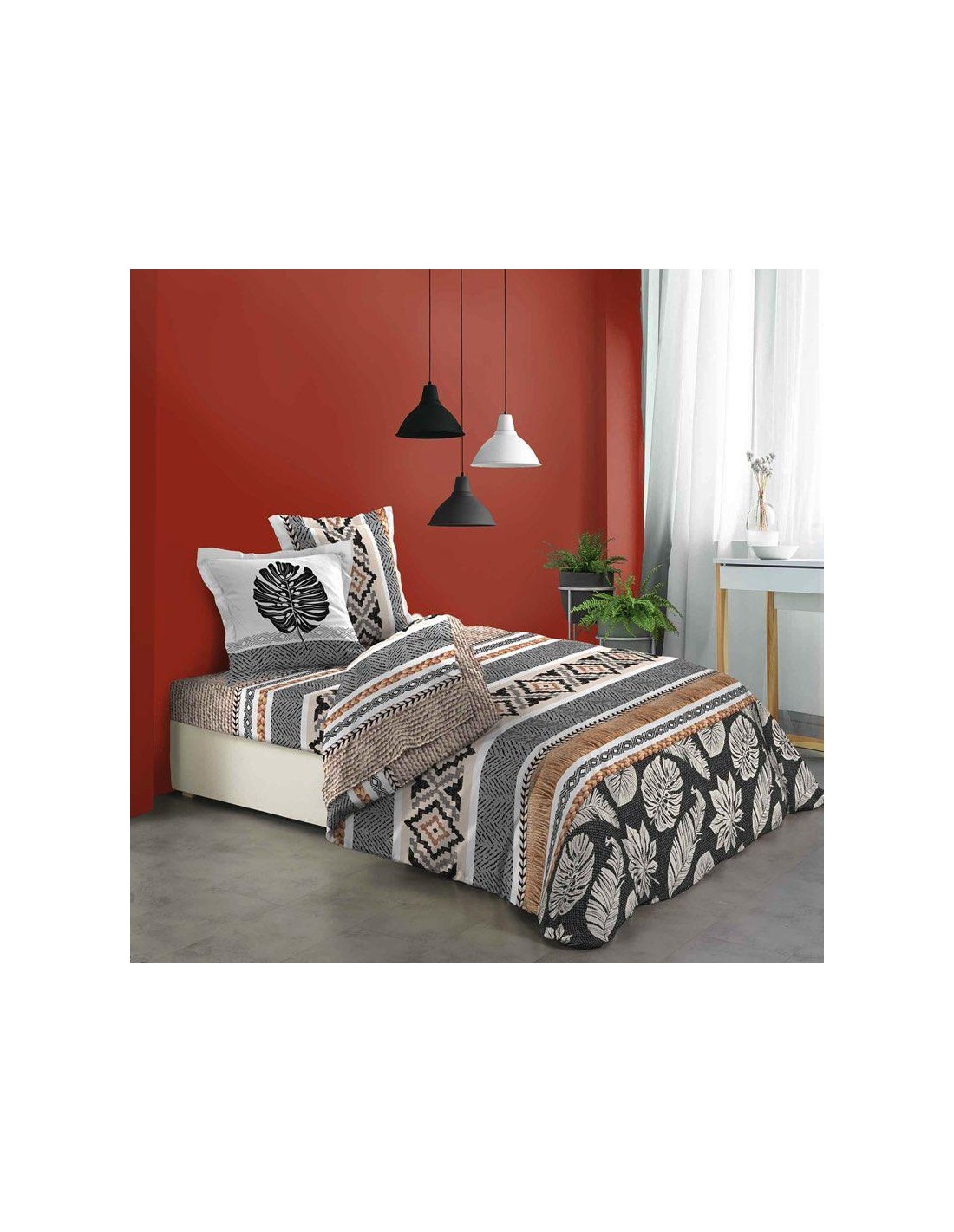 Dimension produit: L. 240 x P. 260 x H. 0,3 cm Détail dimensions: Taies d'oreillers : L. 65 x l. 65 x H. 0.3 cm Housse de couette : L . 240 x l. 260 x 0.3 cm Nombre de fils/cmé : 57 fils Type fermeture : Boutons Matiére: COTON
