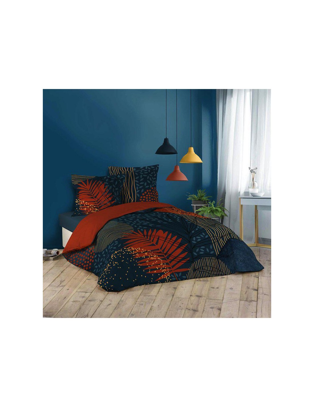 Dimension produit: L. 240 x P. 220 x H. 0,3 cm Détail dimensions: Taies d'oreillers : L. 65 x l. 65 x H. 0.3 cm Housse de couette : L . 220 x l. 240 x 0.3 cm Nombre de fils/cmé : 57 fils Type fermeture: Boutons Matiére: COTON