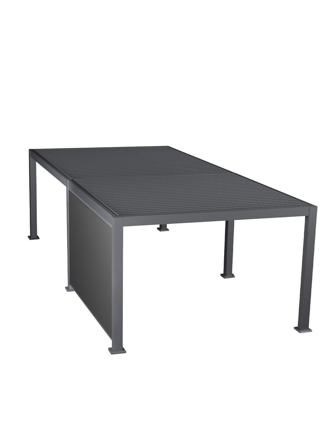 Dimensions : L. 364 x P. 364 x H. 229 cm. Taille tubes latéraux : 14 x 5 cm. Taille poteau : 12 x 12 cm. Gouttiére : 5,4 x 7,4 cm. Lattes toit : 165 x 24 cm. Matiére de la structure : Aluminium. Matiére du tube insert : Acier.