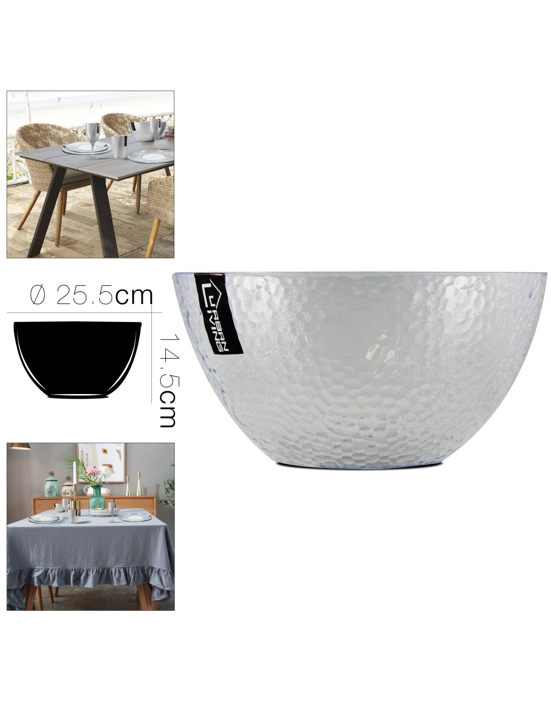 Assiette plate carrée (144099) Dim.:24x24cm. Assiette dessert carrée (144085) Dim.:18x18cm. Plat rectangulaire (144049) Dim.:25x15cm. Plat rectangulaire (144086) Dim.:30x20cm. Assiette plate ronde (141147) Diam. : 26 cm. Assiette dessert ronde (141131) Diam. : 20 cm. Assiette creuse ronde (141130) Diam. : 21 cm. Assiette Pasta Risotto (145284) Diam. : 28...