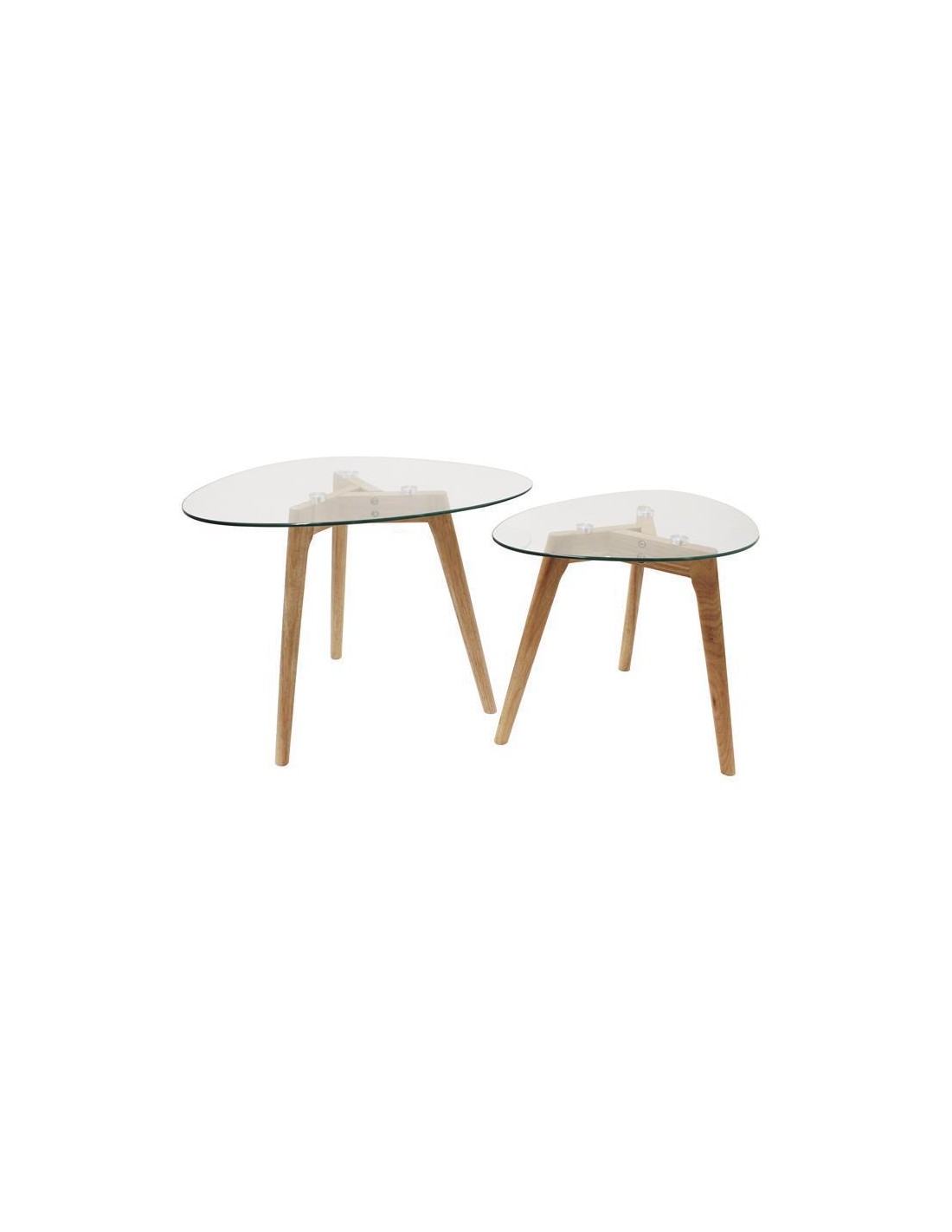 Les tables gigognes ont le vent en poupe ! Découvrez ce modéle en bois agrémenté d'un plateau en forme de galet. Il est réalisé dans un verre trempé ultra-résistant et transparent, vous serez séduit par sa qualité et pourrez apporter un style moderne é votre intérieur tout en adaptant ce duo é vos besoins.Détail : 60x45x43 cm- 3 pieds en bois par table -