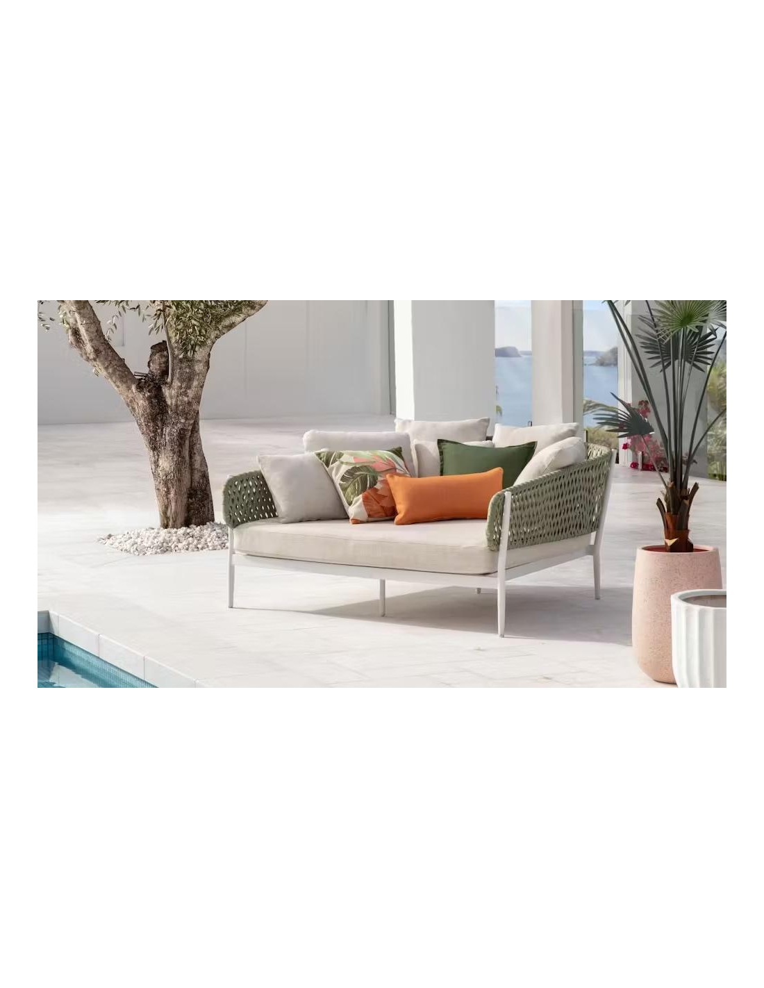 TRANSAT 2 é 3 PLACES PALMA EN RESINE TRESSEE GRISE AVEC COUSSINS BLANC Dimension: D180 x H83 cmTRANSAT 2 é 3 PLACES PALMA EN RESINE TRESSEE GRISE AVEC COUSSINS BLANCDimension: D180 x H83 cm